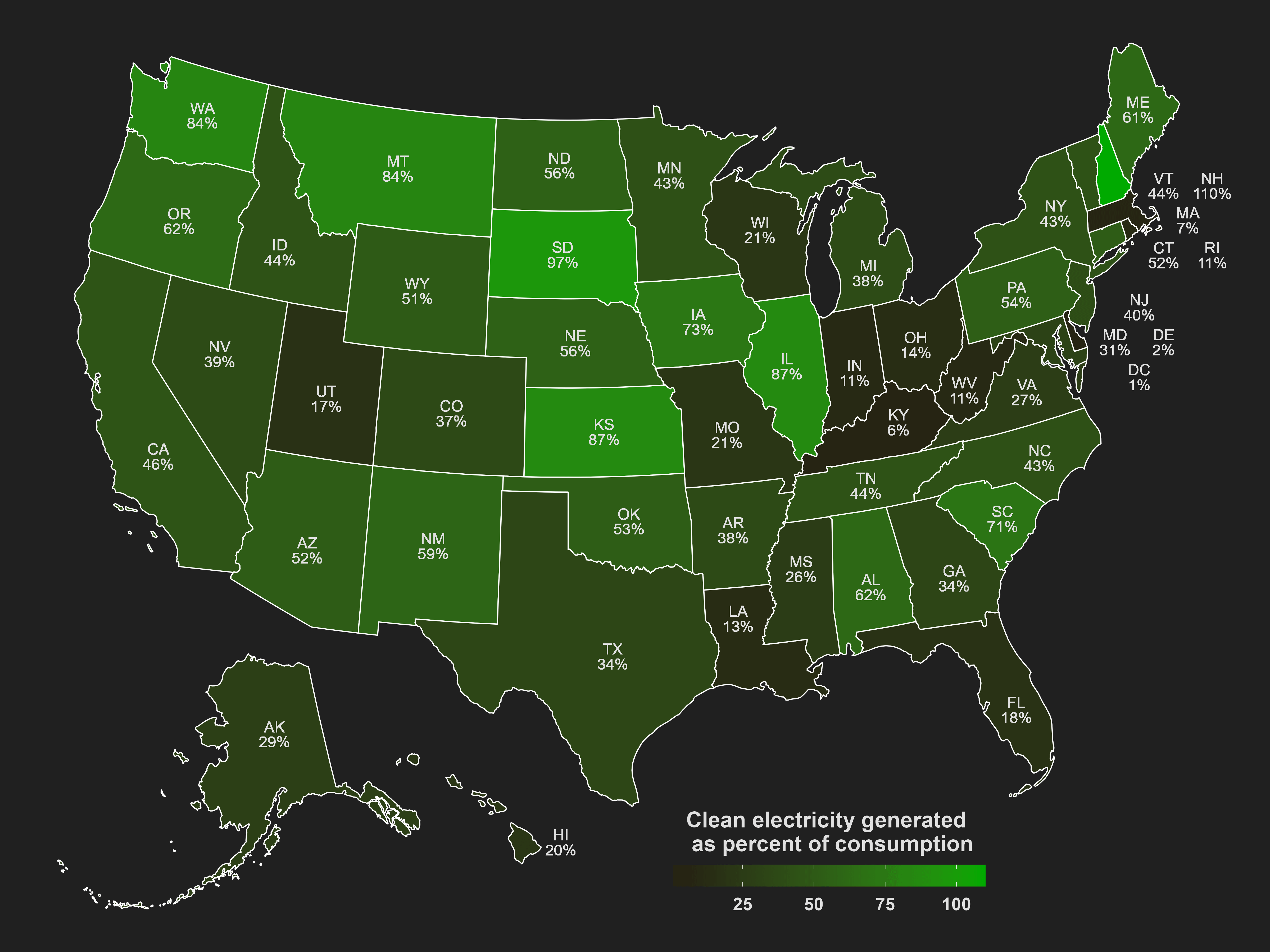 The results are often surprising; plenty of red and blue states can be seen having high or low percentages. New Hampshire generates an abundance of clean energy and exports the leftovers. In second place is deep red South Dakota, and from there it is Kansas, Illinois, Montana, Washington, Iowa, South Carolina – almost perfectly alternating, as if politics had no effect. The most anemic states in generating their own clean energy are (besides DC): Delaware, Kentucky, Massachusetts, West Virginia, Indiana, Rhode Island. The national average is 40%.