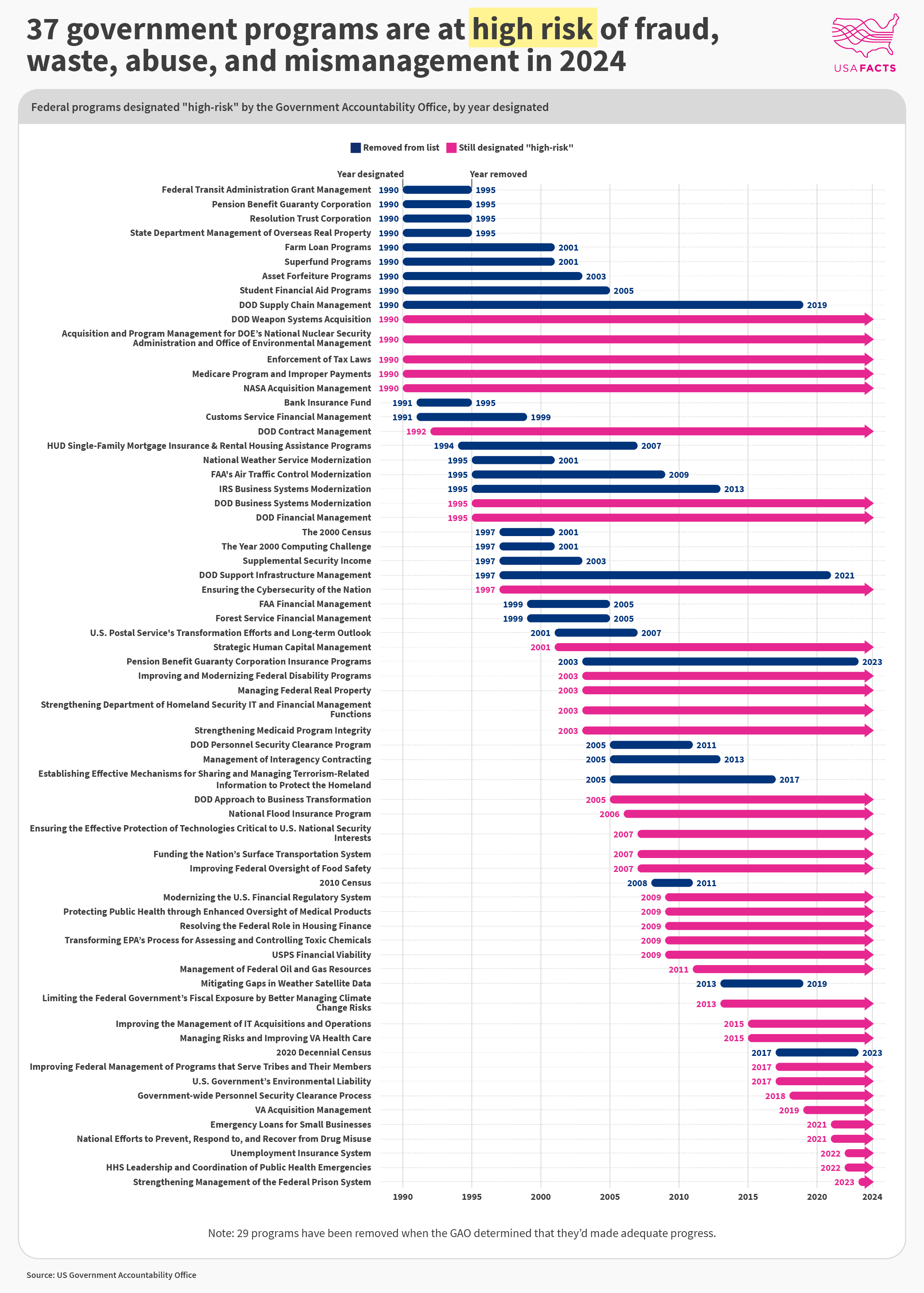 29 programs have been removed since 1990. 2023 year saw the removal of the 2020 Census (which stayed on the list longer than both the 2000 and 2010 censuses) and Pension Benefit Guaranty Corporation insurance programs.