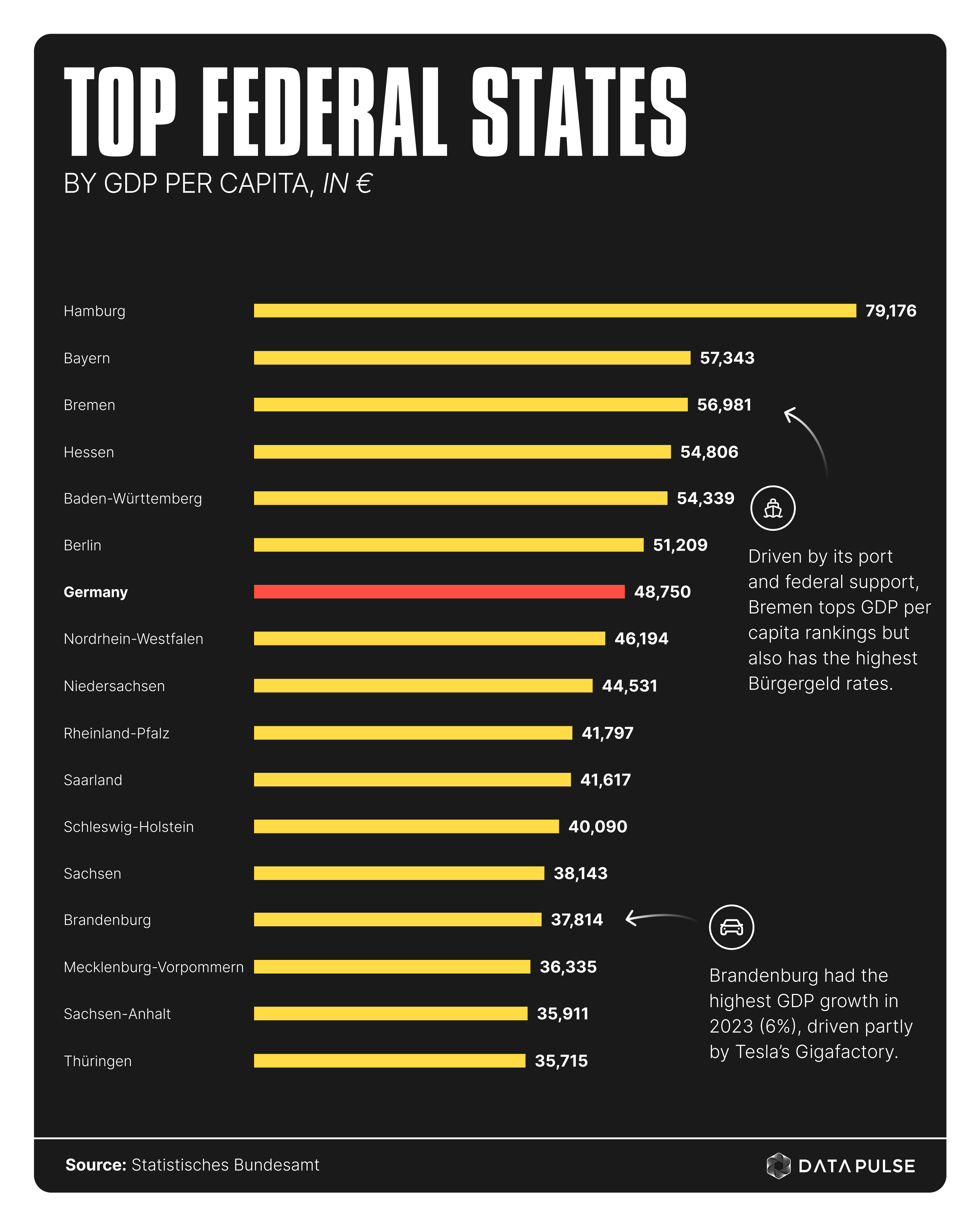 **Hamburg is probably the best place to live in Germany – at least when you look at GDP per capita by state. That’s because the GDP there is more than 50% higher than in the rest of Germany.**