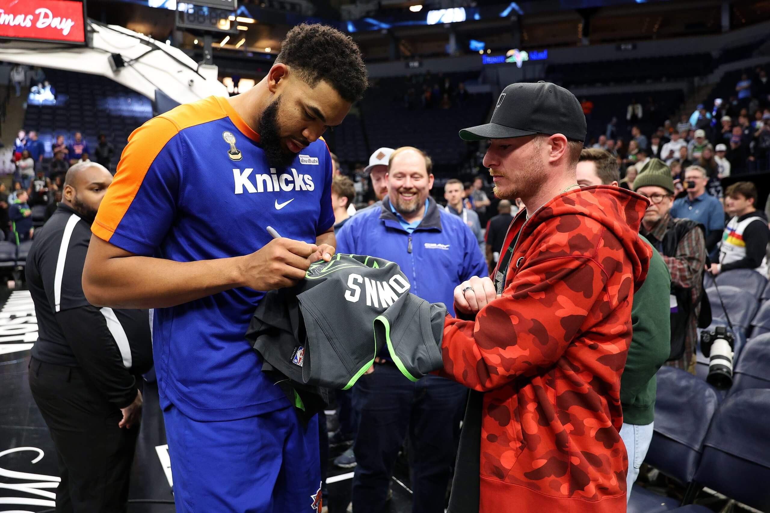 Karl-Anthony Towns signs an autograph for a fan after the Knicks’ win over the Timberwolves. (David Berding / Getty Images)