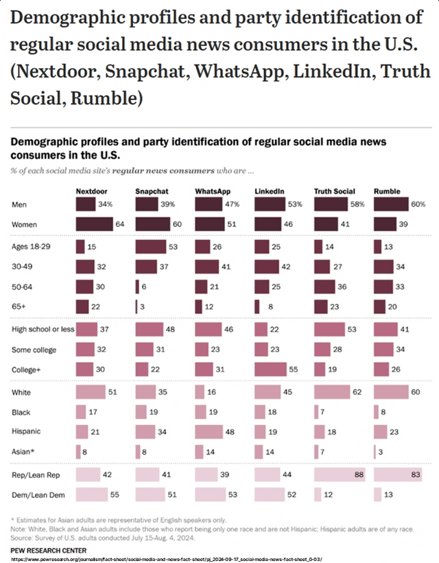 Demographic profiles and party identification of regular social media news consumers in the U.S. (Reddit, Facebook, YouTube, Instagram, TikTok, X (Twitter), Nextdoor, Snapchat, WhatsApp, LinkedIn, Truth Social, Rumble)