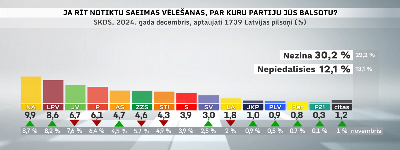 In second place is another opposition party, the populist Latvia in first Place on 8.6% support, and third place is held by the New Unity party of Prime Minister Evika Siliņa which continues to shed support. Its rating in December was 6.7%.