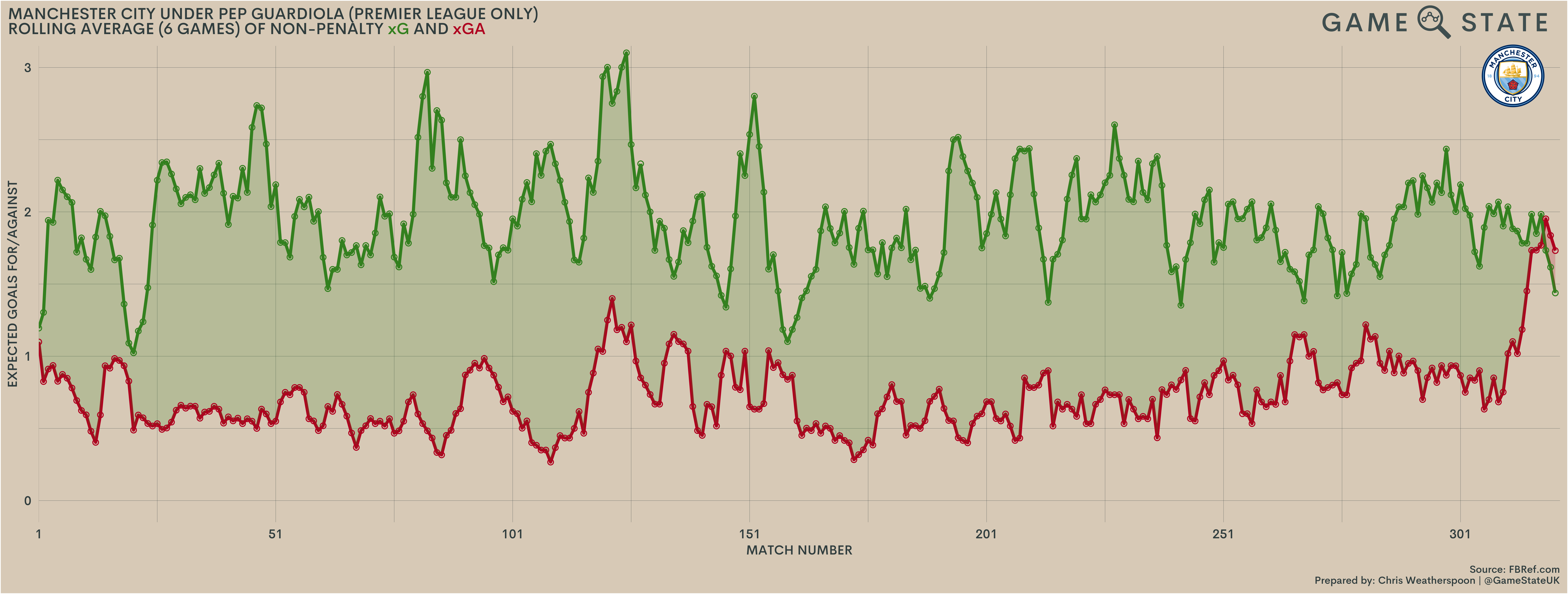 Interesting that there’s been a very gradual defensive decline over the past few seasons. Since around match 170 they’ve gone from a peak defensive stat of <0.5 xGA to nearly 1 xGA. And now, that decline coinciding with Rodri’s long-term injury seems to have turned into a collapse.