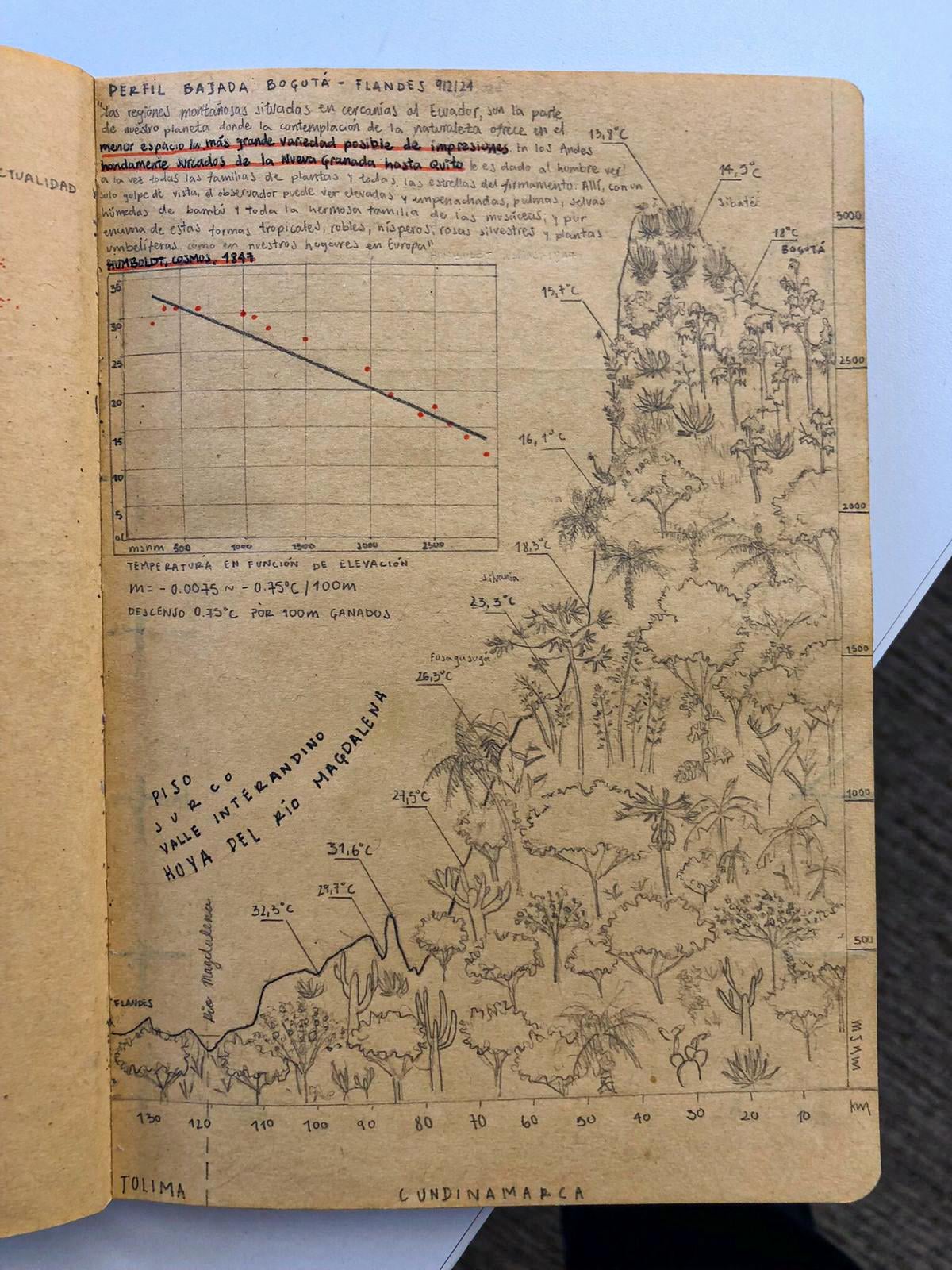 The graph shows the temperatures I recorded on the road between 3-6pm as a function of the elevation where they were taken, which shows us that in this section at this time for every 100 meters of elevation gained, the temperature drops 0.75°C, within the profile the illustrations of the plants that I was seeing to illustrate Humboldt’s quote.