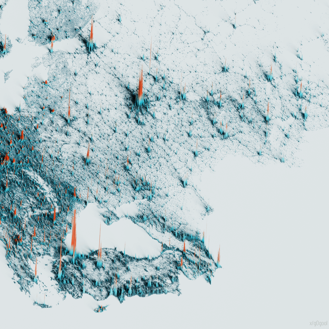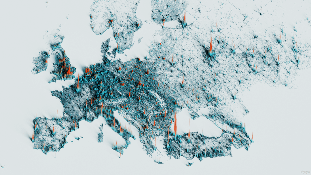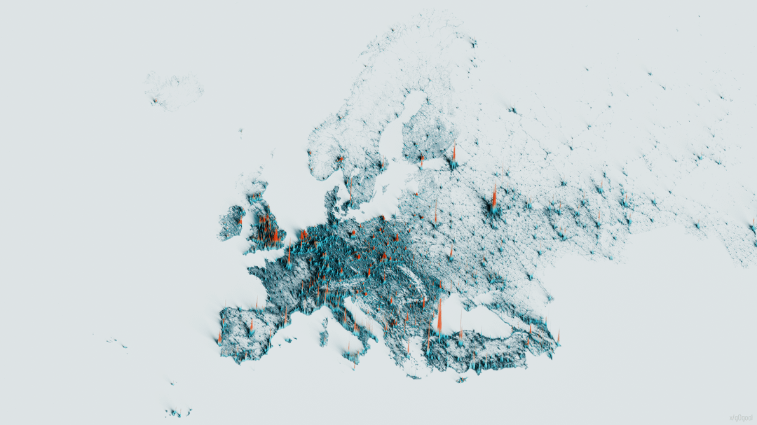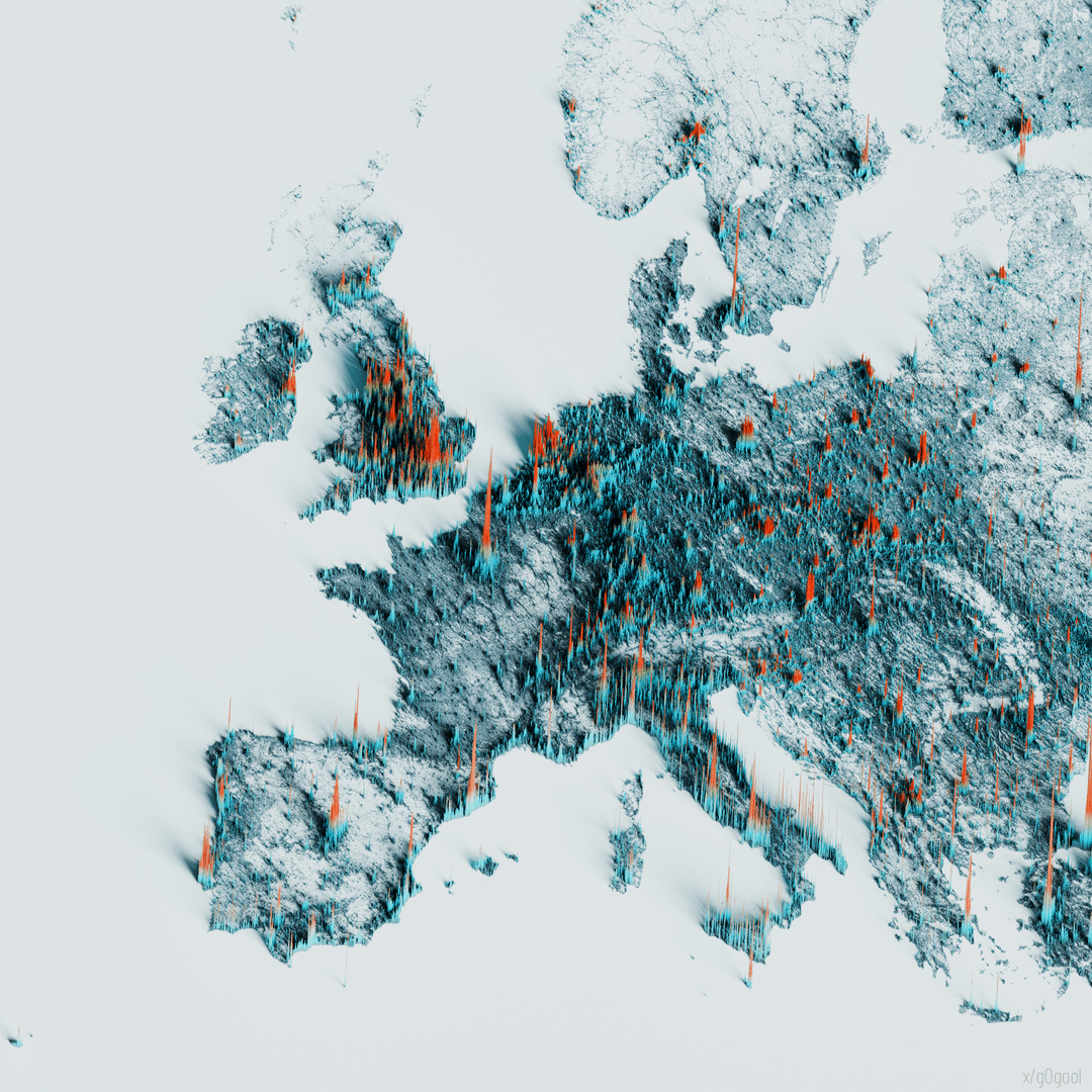 Population Density Map for Europe | Made with Blender and Data from Kontur Population Density for 400m H3 Hexagons 2023 [OC]