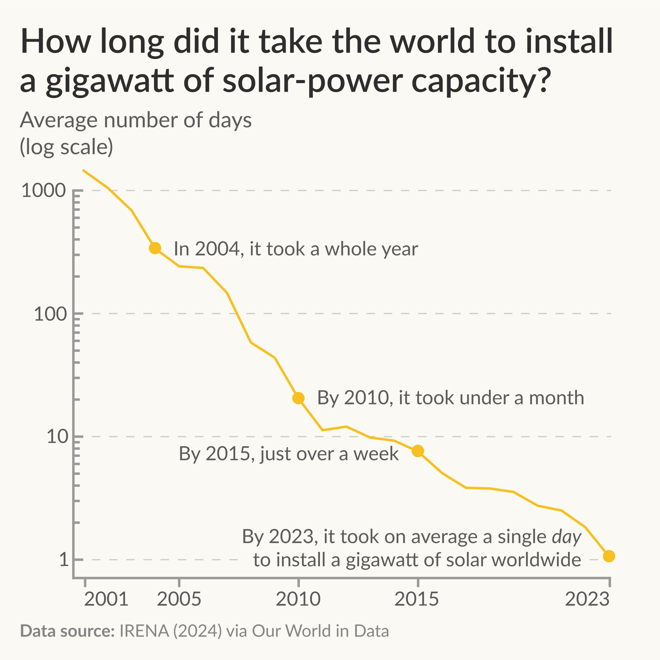 **Data source:** International Renewable Energy Agency (IRENA) (2024) via [Our World in Data](https://ourworldindata.org/grapher/installed-solar-pv-capacity?country=~OWID_WRL). My own calculations to convert that data into average number of days to install a gigawatt.