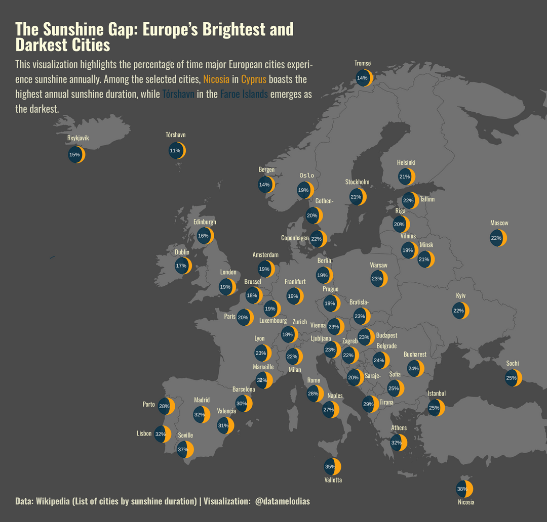 I don’t really understand, how can Bergen have less sun than Tromso? Is that because of the long hours of sun in the summer? Generally the trend seems to be more sun the closer you get to the equator, so why the trend change? On a similar note, how Amsterdam have so much less sun than Scandinavia? Also quite a sudden decrease in the UK, even if you account for latitude.