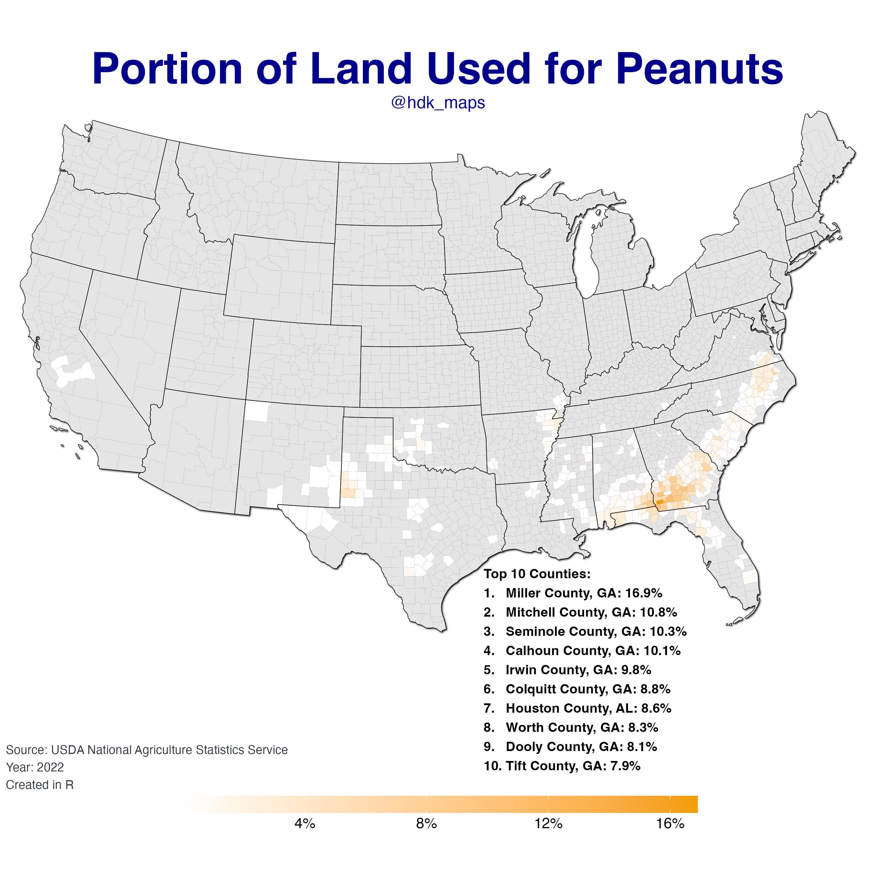 [OC] Portion of Land Area Used for Peanut Farming in the US Posted by haydendking Tags:DataData Is BeautifulDataIsBeautiful 6 comments Data: [https://quickstats.nass.usda.gov/#192AC790-6279-32C2-9483-94F716CC6D81](https://quickstats.nass.usda.gov/#192AC790-6279-32C2-9483-94F716CC6D81) Tools: R – packages: ggplot2, dplyr, stringr, sf, usmap, ggfx I was just wondering this! That’s why GA is called the peanut state. See? Says it right there on the license plate Now all the boiled peanuts down here make sense. Jimmy Carter killed himself after his peanut farm withered When I went, a family member insisted we try boiled peanuts. I couldn’t figure out what she was saying until we came up to the sign. I really didn’t want to taste bald penis. Comments are closed.