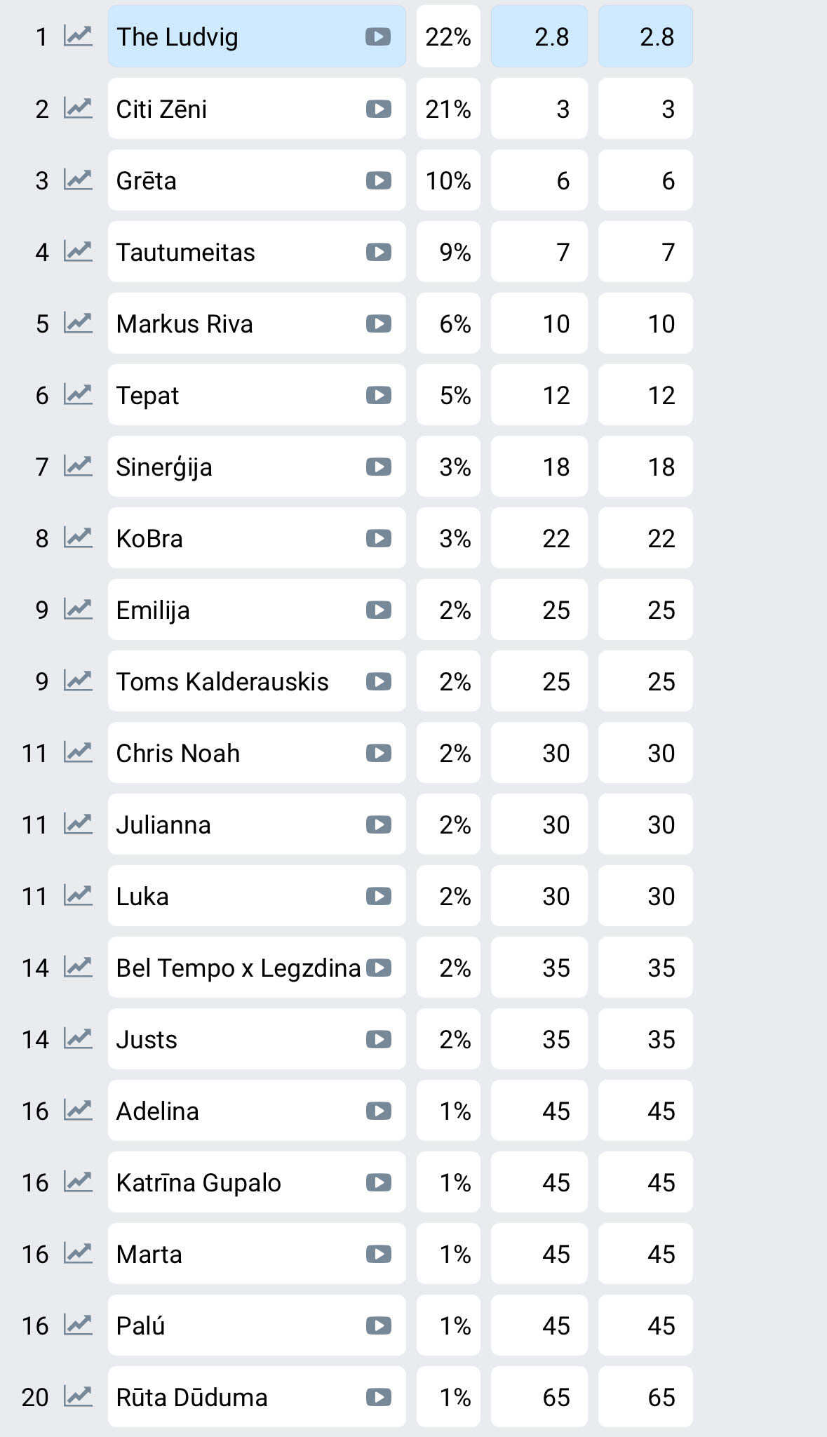 In detail, with a narrow margin of just 1%, The Ludvig appears to be the bookmakers’ favourite to win and represent Latvia, holding 22% of the odds. Close behind are Citi Zēni, the country’s representatives in 2022, with 21%.