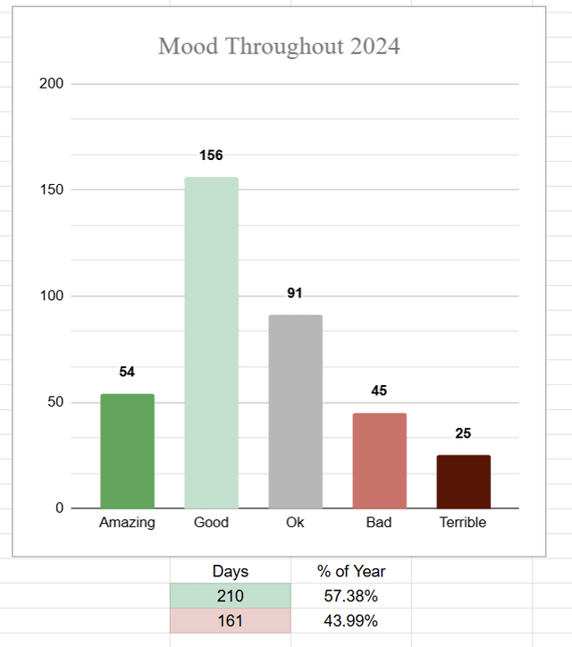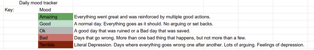 This is awesome OP, I’ve done something almost identical for the last few years, tracking mood along with a few other facets that impact my well being. It really helps me identify baselines and trends. So fun having a year’s worth of data to analyze at the end!