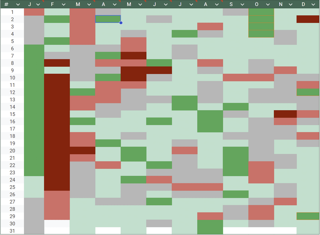 I’ve been using a mood tracker app like this for the last 5 years. I highly recommend it. Mine also lets me use it as a journal and add pictures and symbols too. Pixel Year on the play store for anyone interested.