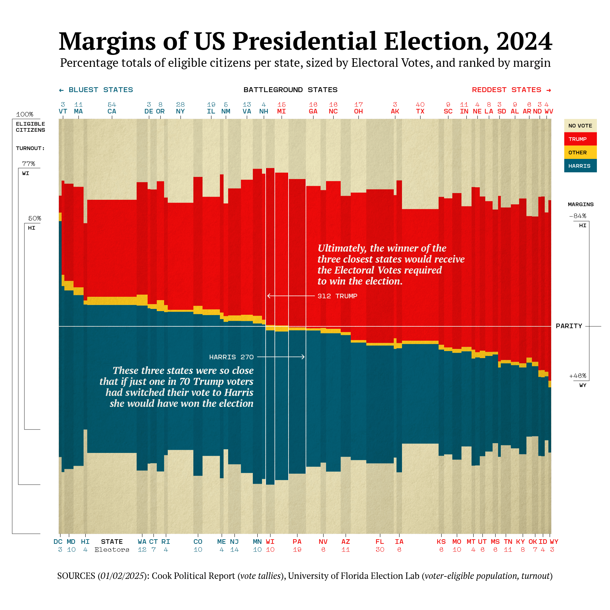 [OC] This chart is essentially a stacked bar chart of votes cast during the 2024 U.S. Presidential election. Each bar shows the percentages per state of the voter-eligible population, including votes for Trump, Harris, Other, or no vote. Each state’s bar is then sized per its Electoral Votes and ranked by margin from bluest (at left) to reddest (at right) according to the final margin. Votes cast are centered vertically in the field of non voters to illustrate the swing margin.