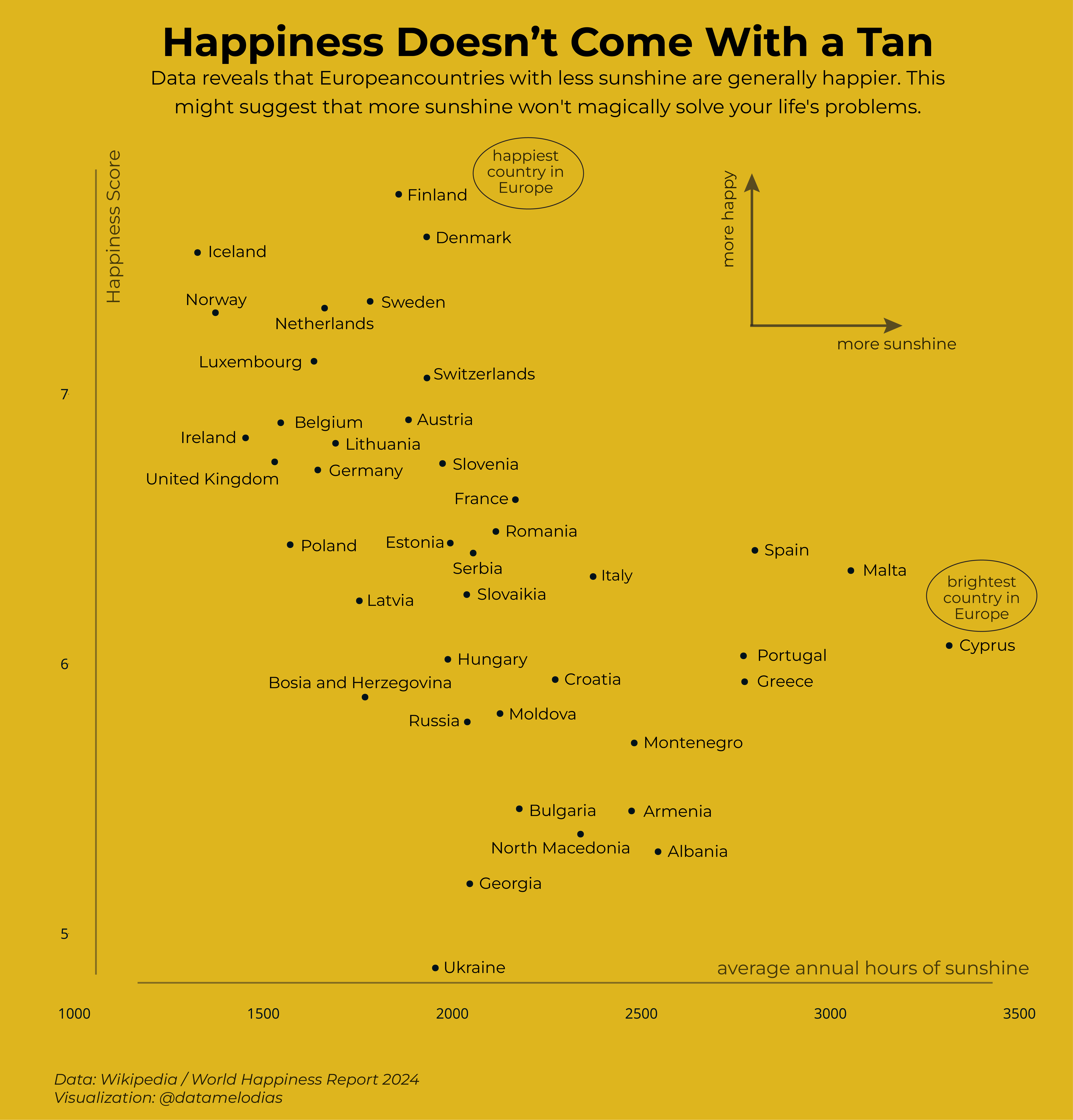 IIRC the happiness index is based on measuring things that *should* make people happy *about their government*. It’s not like a survey of “on a scale of 1 to 10, how happy are you?” Like you might imagine. Also recognize the insane deviation between places like Finland and Ukraine. If anything, this is a weak correlation between things like government corruption and sunlight.