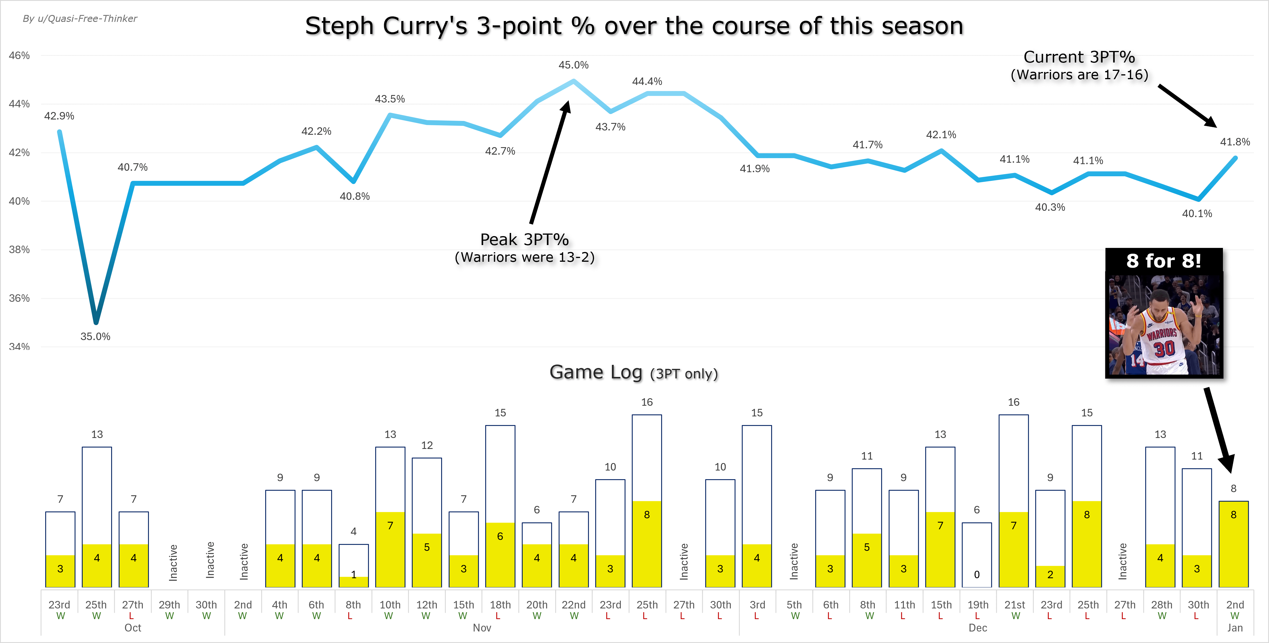 This might be better titled “How Curry’s 3 point % has *not* fluctuated this season.” Almost none of these games individually or in a series show a meaningful deviation from the overall average of 42%. It takes almost exactly as long as you’d expect, about 20 games, to find a random statistical fluctuation surprisingly outside the confidence interval, seen in the 8/8.