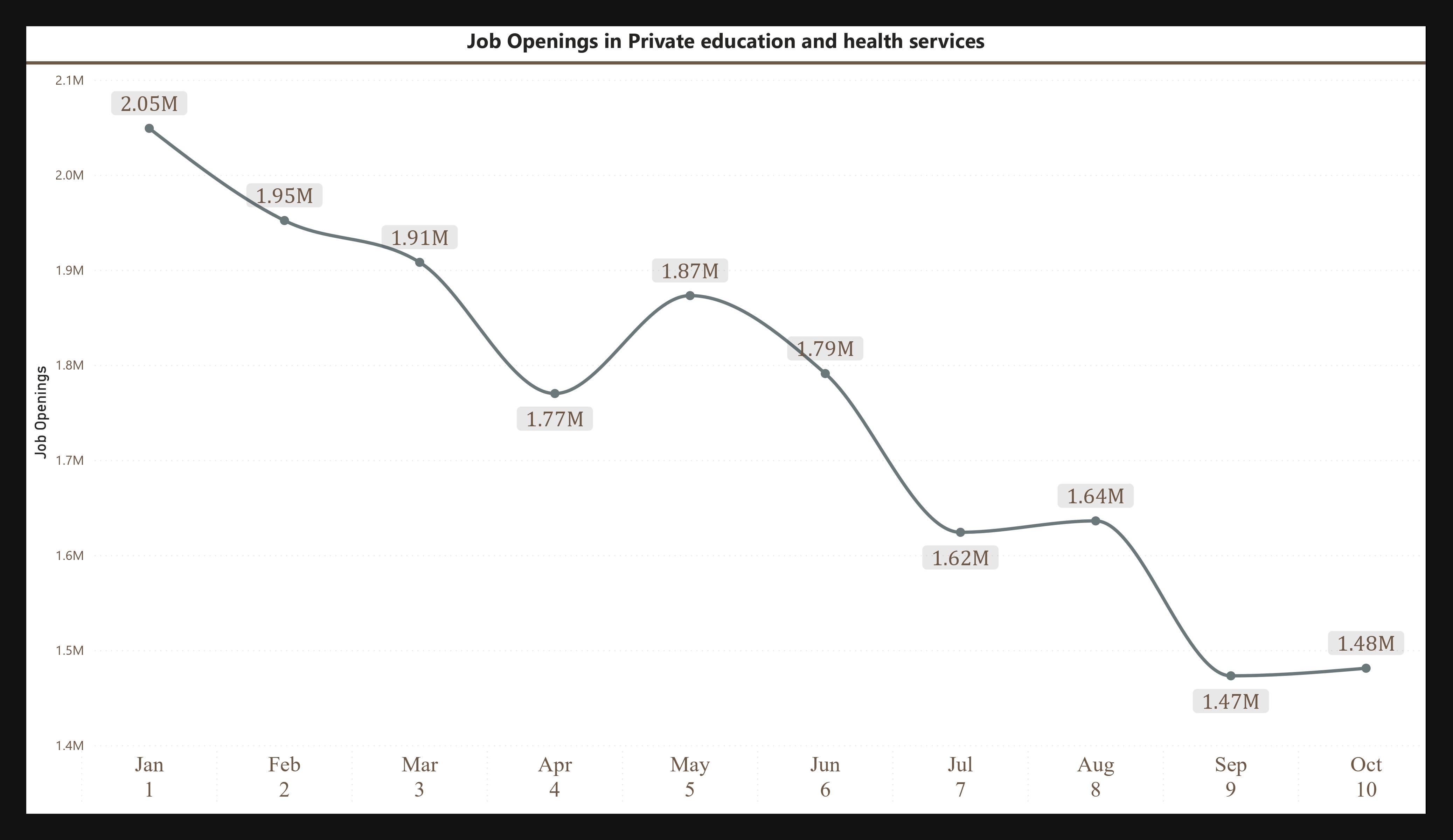 Crux : In **January 2024**, there were **2.05 million** job openings, but by **October 2024**, this had fallen to **1.48 million**, marking a significant reduction of **570,000** openings.