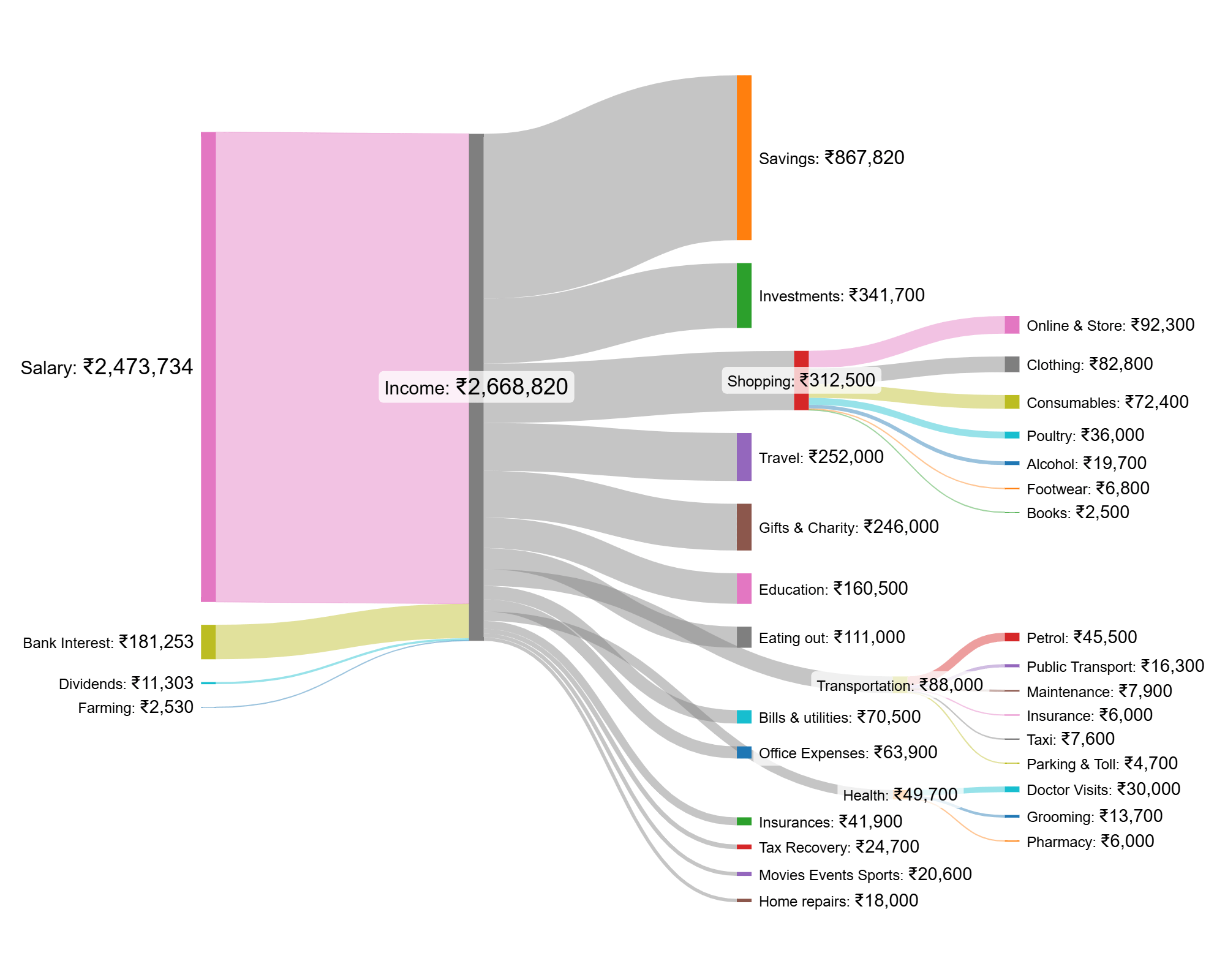 Living in a tier 2 city in India with my spouse and 2 kids aged 4 & 7. I tracked every expense for the year 2024 and wanted to visualize where all the money is going. Thus leading to this chart.