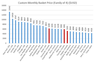 Monthly Cost of Living of some International Cities (custom basket for 1 person & family of four) (Canadian cities in red cuz I am Canadian)