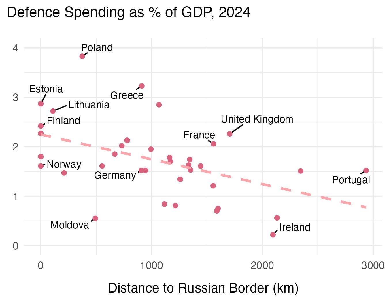 Inspired by [this](https://www.reddit.com/r/europe/comments/1hyuhaw/the_association_between_defence_spending_and/) post in r/europe I created by own version with updated values from 2024 and the shortest distance from border-to-border (excluding exlaves, especially Kaliningrad).