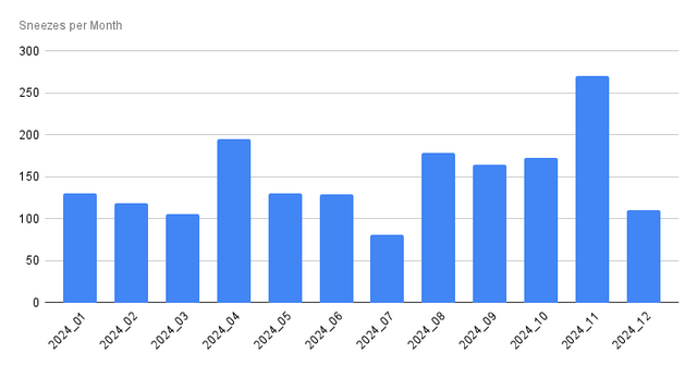 [OC] I recorded my sneezes throughout 2024. All 1789 of them. Posted by TropicalLasagna Tags:DataData Is BeautifulDataIsBeautiful 9 comments 1789 in a year is certainly nothing to sneeze at. You should see a Dr about that. One sneeze every four or five hours on average Maybe you should move out It’s a bit of a tangeant, but you might like [this fantastic episode](https://soundcloud.com/boontavista/unlocked-bonus-episode-please-step-into-my-sneezatorium) about the sneeze fetish community. Yes, there’s people with a sneeze fetish, and yes you can monetize it. RIP to OPs keyboard. Never stood a chance. this is crazy that you tracked very impressive I talk about you when I need anedoctes about lifelogging Crazy, I think I sneeze about 3 times a year. Comments are closed.