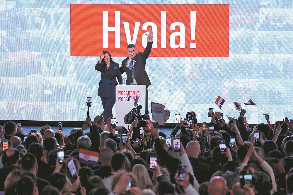 Croatian President Zoran Milanovic and his wife celebrate victory with supporters after winning the presidential runoff in Zagreb on Sunday. The sign reads “Thank You”. ANTONIO BRONIC/REUTERS