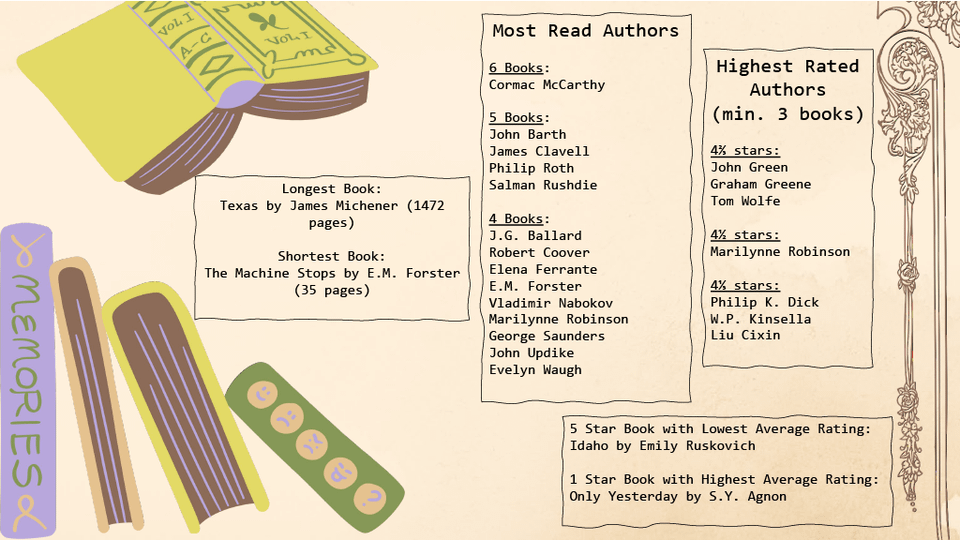 3. The most interesting thing to me is that in over 500 books your most read author is only 6 books.