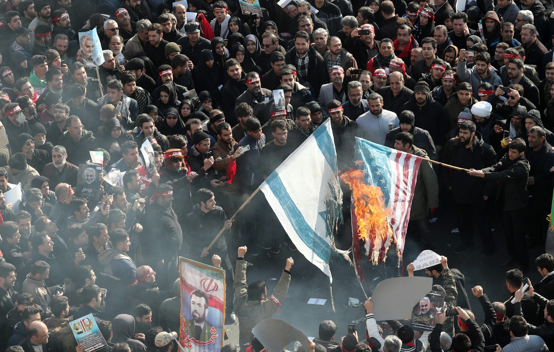Iranians burn US and Israel flags during Qasem Soleimani’s funeral in Tehran, Iran.