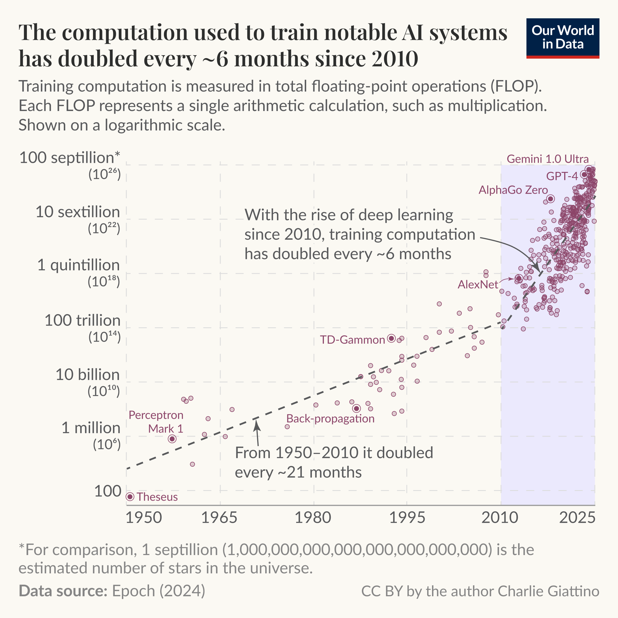 Data source: The data comes from [Epoch](https://epoch.ai/data/notable-ai-models), a research organization that tries to understand where AI might be headed by analyzing trends in computation, data, investments, and more. They maintain one of the most comprehensive datasets on AI available.