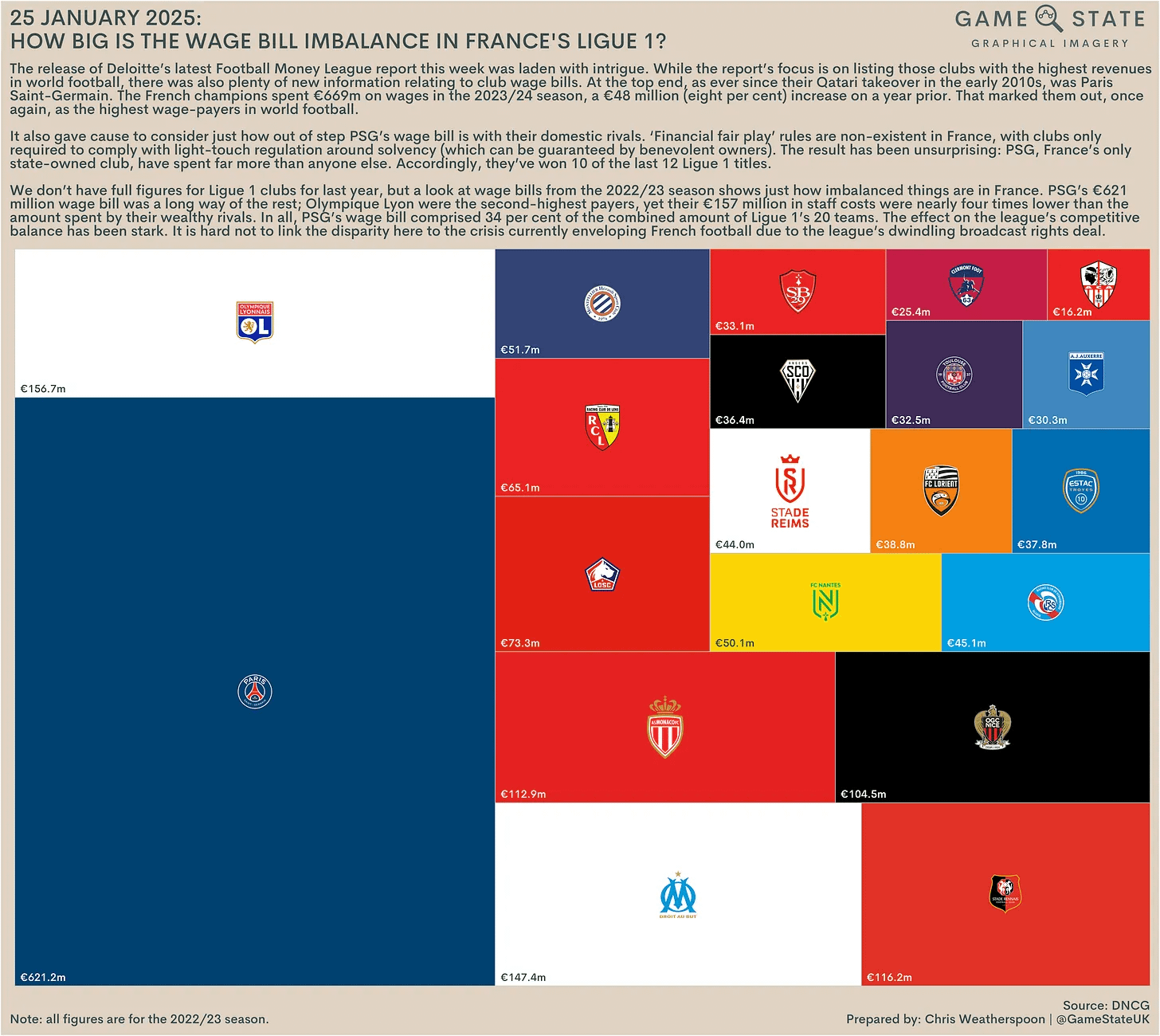 [OC] How big is the wage bill imbalance in France’s Ligue 1? Posted by GameStateUK Tags:DataData Is BeautifulDataIsBeautiful 3 comments PSG is 621 milion. Coinsidance? PSG funded by a host of qatari sponsors… And they’re not winning that much Comments are closed.