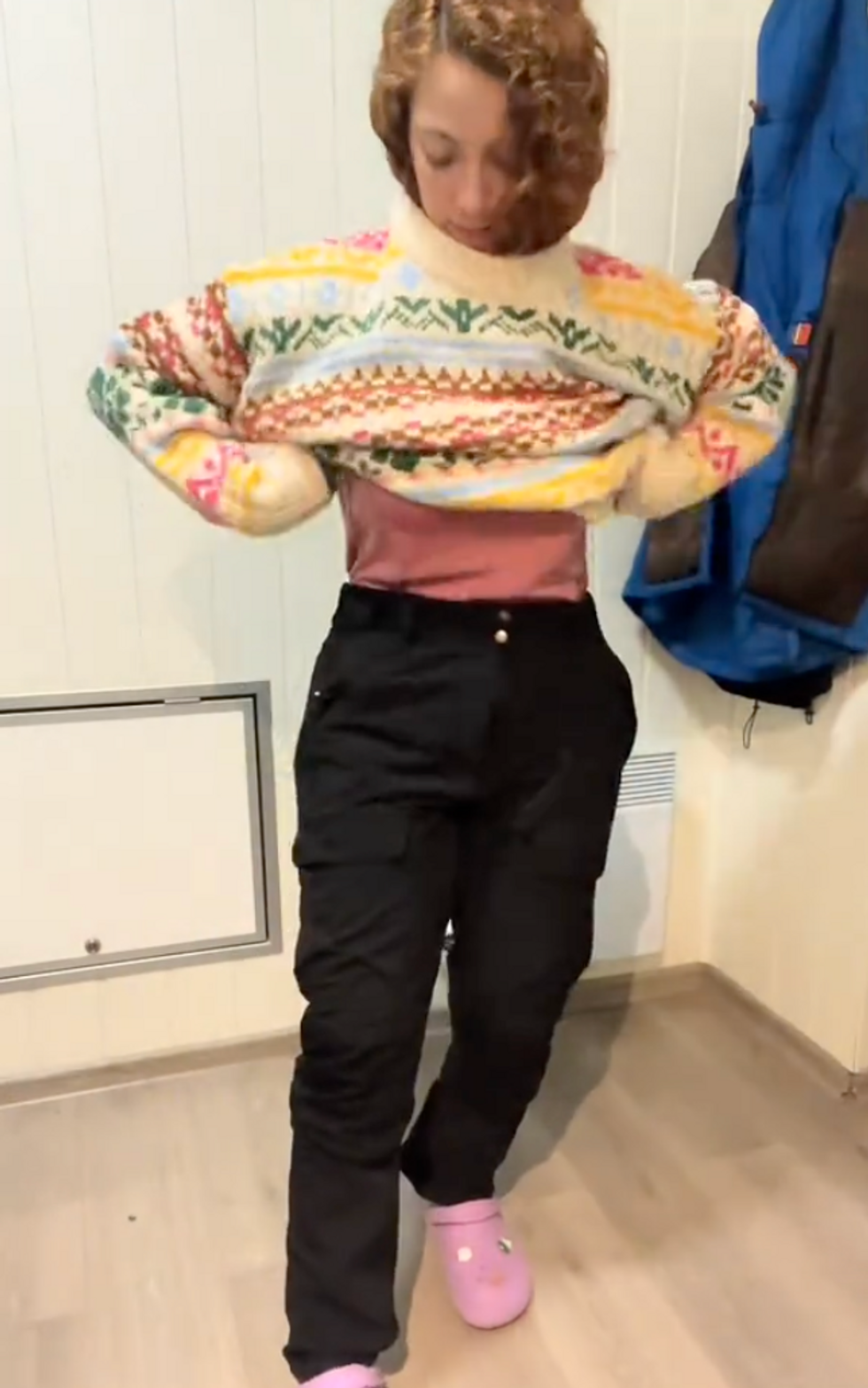 She then proceeded to put on her everyday clothes, finishing off with a puffer jacket for that extra boost of warmth.