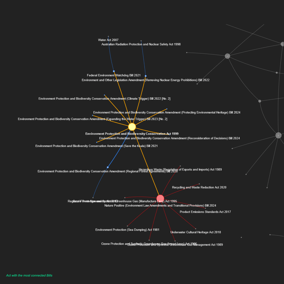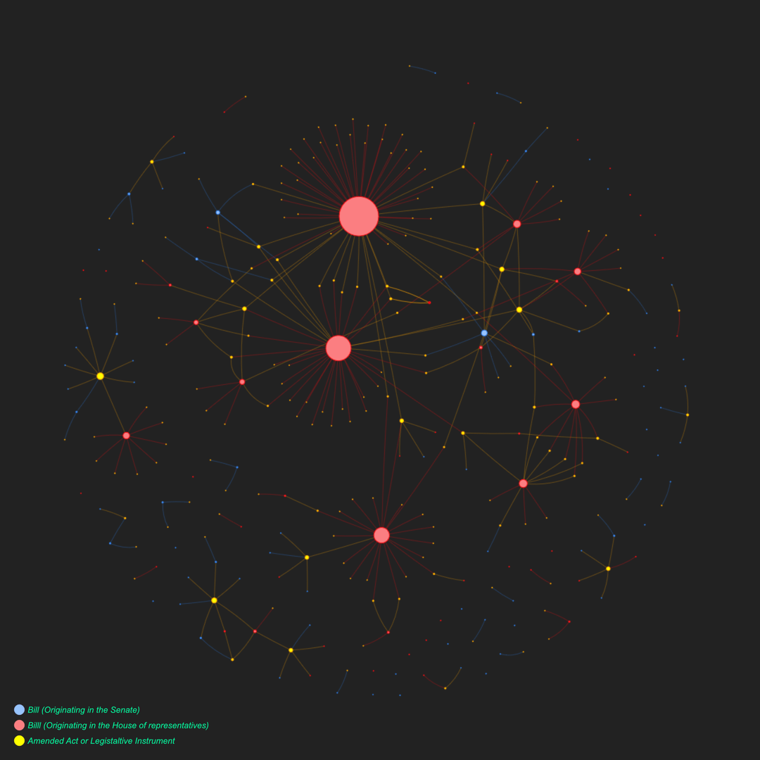 All nodes are scaled by the number of links connected to it. The the boardest bill is from the House of Representatives (red), the Senate actually has more bills at the moemnt (blue).