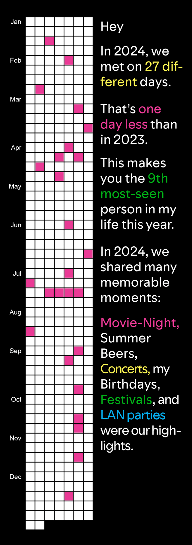 I love this. It’s a great idea and a fun presentation of data that isn’t usually presented. I would love receiving one and would be looking back at each of those dates trying to remember what each occasion was. And tbh I’d be happy to be anyone’s ninth most-seen friend.
