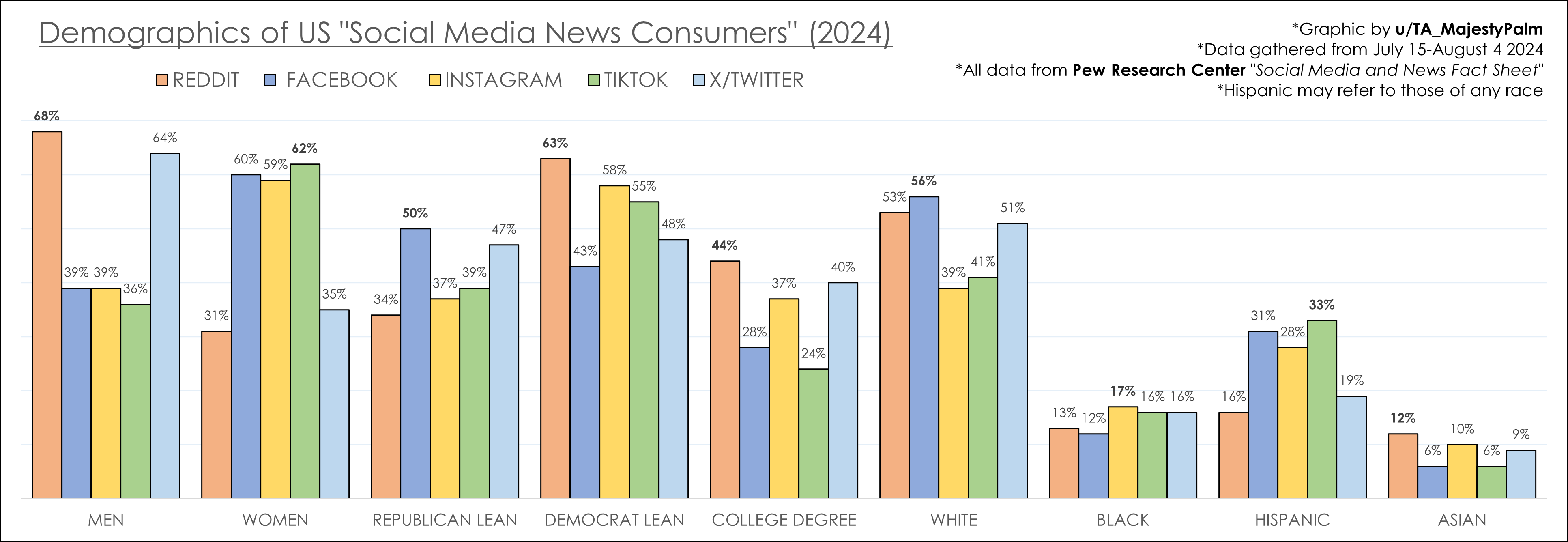 Graphic created by me using excel, all data from Pew Research Center study here: https://www.pewresearch.org/journalism/fact-sheet/social-media-and-news-fact-sheet/ They have many more details than shown here, including methodology and more/better graphics.