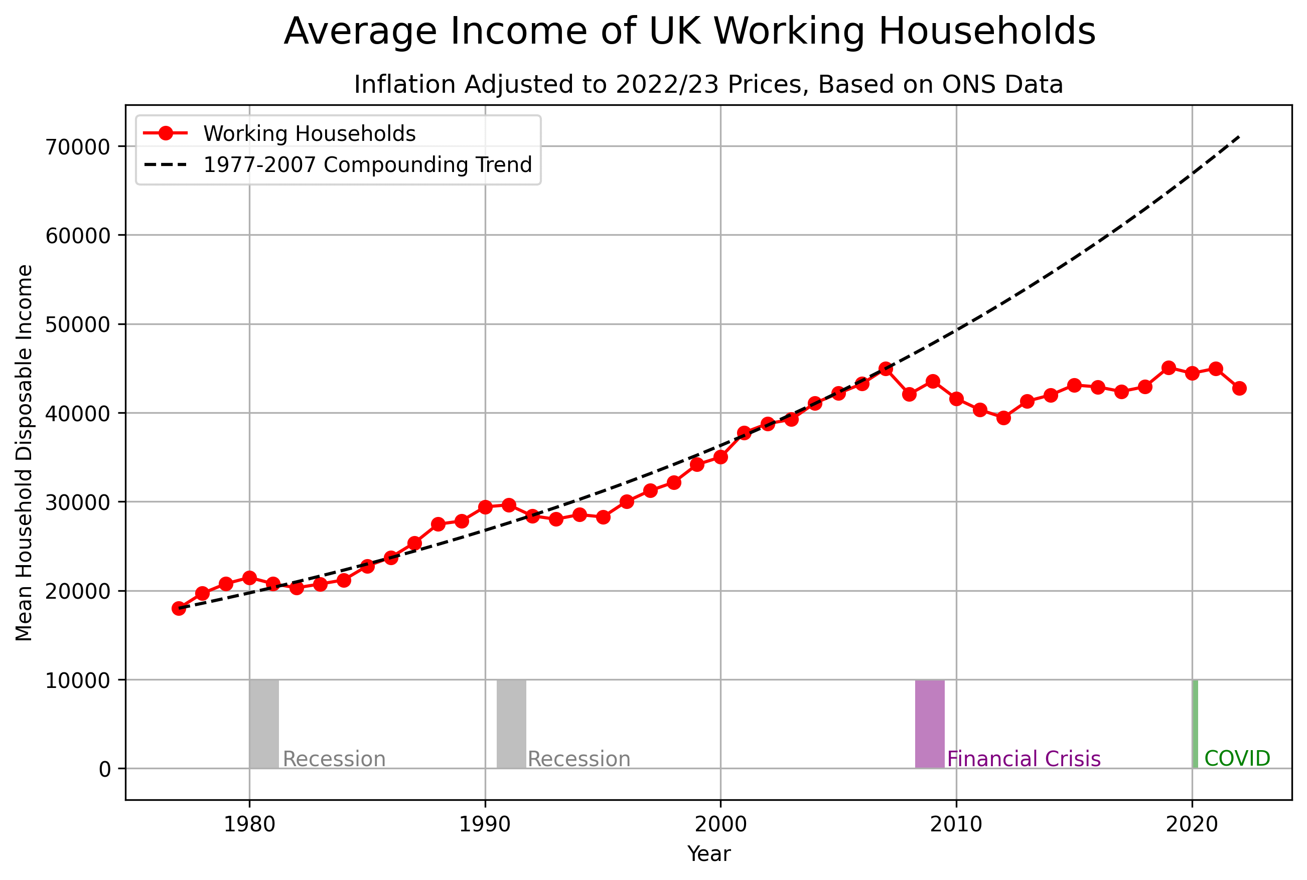 The data in this graph is beautiful. It shows how our societies need to change in the face of economic reality. The arbitrary line imposed on top is meaningless. Why should it keep going up like that? How would everyone getting more and more and more on top of what they actually need, forever, work in the long term? Is a mean disposable income of £70k even desirable? Shouldn’t we raise the tax burden and fix some potholes before everyone gets a Merc?