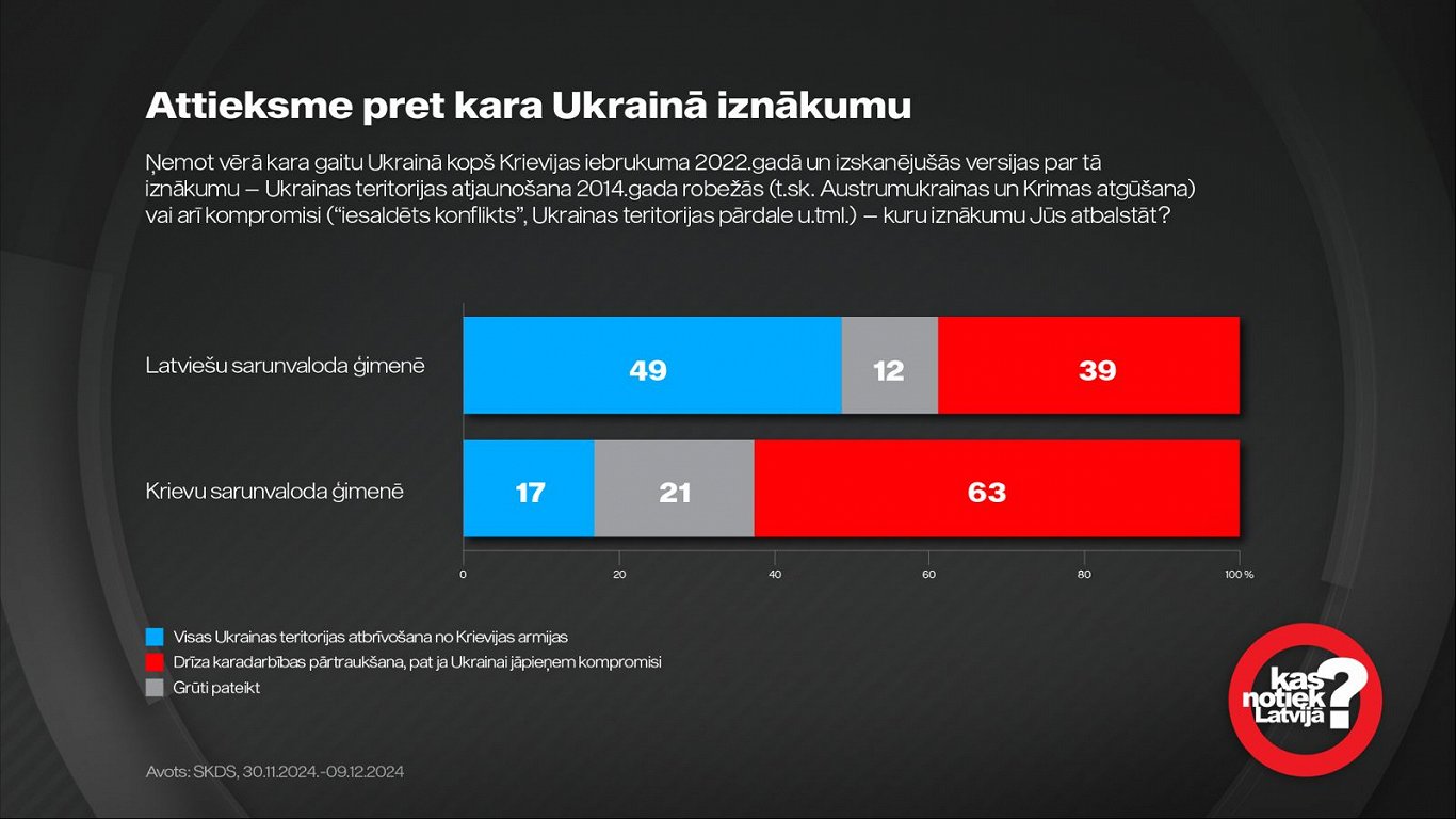Kompromisu, pat ja Ukrainai jāatsakās no daļas teritorijas, līdzīgi kā pērn, vairāk atbalsta respondenti, kuru sarunvaloda ģimenē ir krievu, proti, 63%. Pērn šajā grupā šo atbildi izvēlējās 68% aptaujāto. Kompromisu starp ģimenēs latviski runājošajiem atbalsta 39%. Savukārt visas Ukrainas teritorijas atbrīvošanu no Krievijas armijas starp latviski runājošajiem atbalsta 49% respondentu, kamēr starp ģimenēs krieviski runājošajiem – 17%. 2024. gada ziemā tie bija attiecīgi 68,1% un 19,1%.
