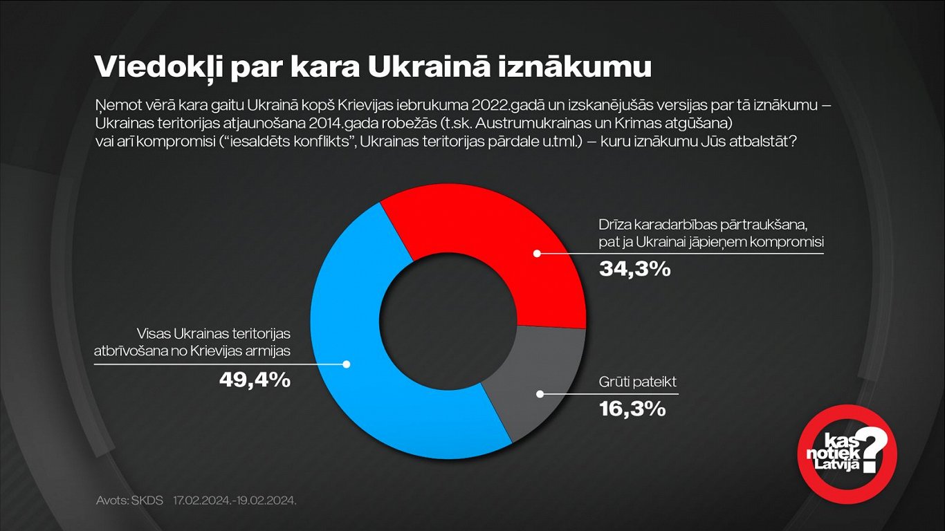 Aptaujas ietvaros respondentiem tika jautāts: “Ņemot vērā kara gaitu Ukrainā kopš Krievijas iebrukuma 2022. gadā un izskanējušās versijas par tā iznākumu – Ukrainas teritorijas atjaunošana 2014. gada robežās (t.sk. Austrumukrainas un Krimas atgūšana) vai arī kompromisi (“iesaldēts konflikts”, Ukrainas teritorijas pārdale u.tml.) – kuru iznākumu jūs atbalstāt?” 37,2% aptaujāto atbildēja, ka, viņuprāt, vēlamais iznākums ir visas Ukrainas teritorijas atbrīvošana no Krievijas armijas. Savukārt 47,3% respondentu pauda atbalstu kompromisiem, pat ja tie nozīmētu konflikta “iesaldēšanu” vai Ukrainas teritorijas “pārdali”. 15,5 % aptaujāto bija grūti atbildēt uz šo jautājumu.