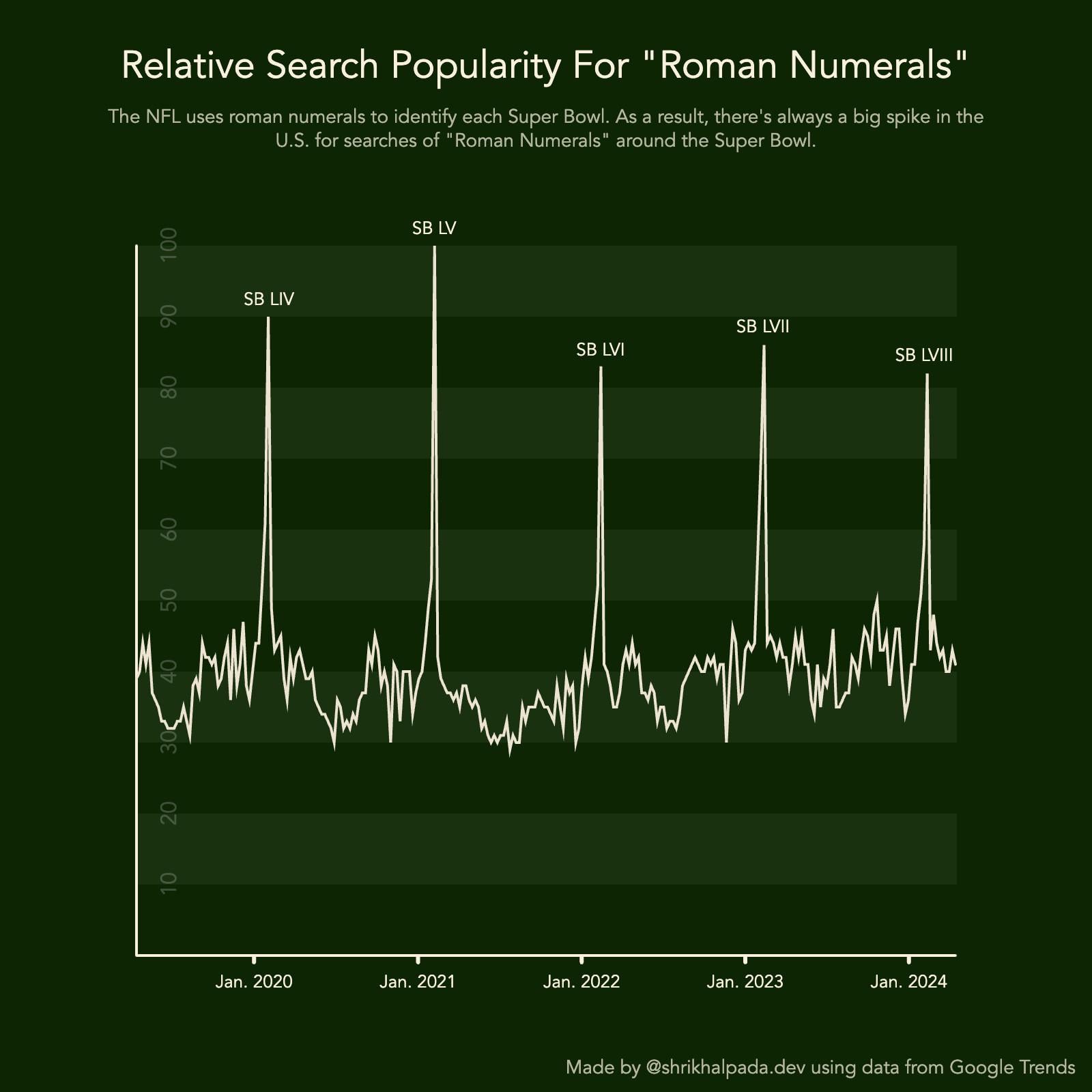 [OC] Searches for “Roman Numerals” always spike around the Super Bowl Posted by Shriracha Tags:DataData Is BeautifulDataIsBeautiful 3 comments This is one of my favorite correlations ever. I made this chart as part of the 30 Day Chart Challenge last April. You can see the other charts I made [here](https://perthirtysix.com/essay/30-day-chart-challenge-2024) if you’re interested! Every year I invest in Roman numerals on Super Bowl Sunday , but the markets don’t open until Monday…. So far I’m down 99%. But this is Super Bowl Licks.  I heard it on the radio Comments are closed.