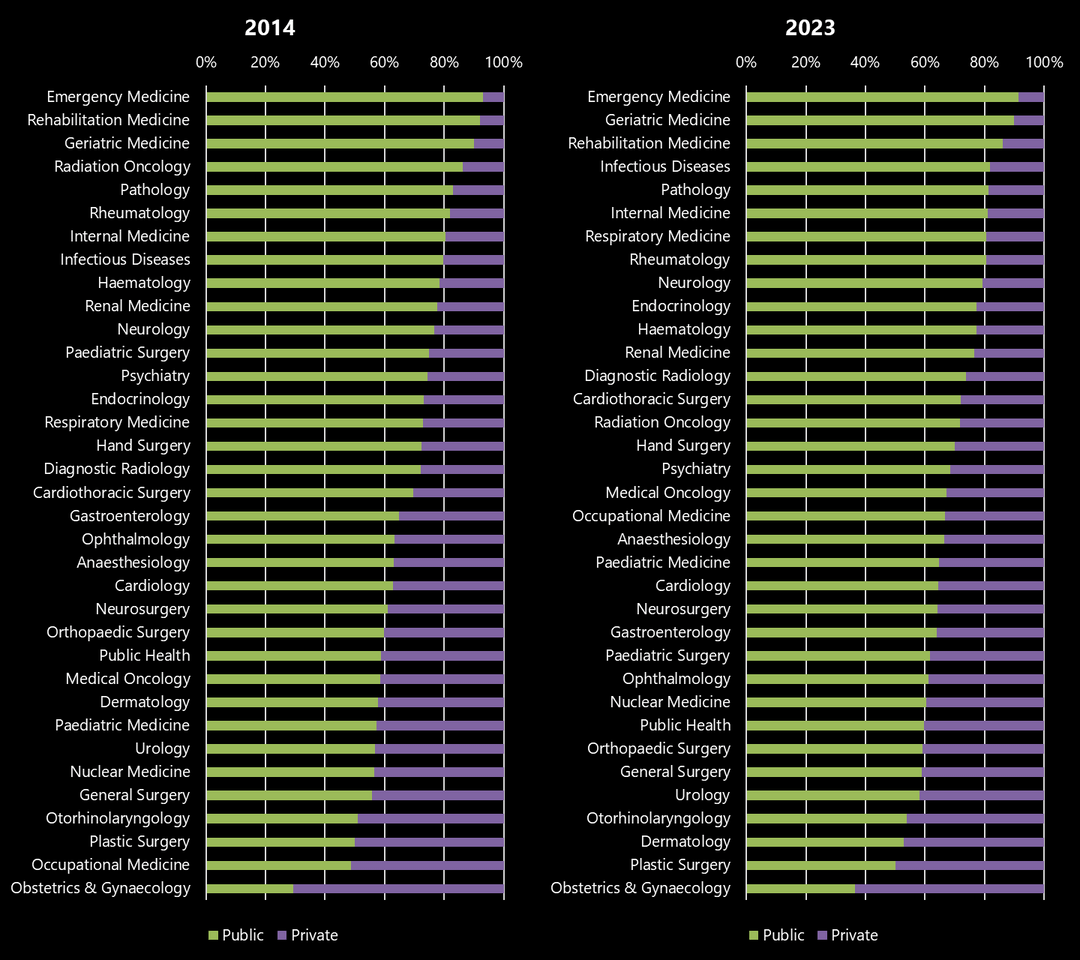 [OC] Distribution of medical specialists across public and private sector in Singapore, 2014 vs 2023 Posted by haisufu Tags:DataData Is BeautifulDataIsBeautiful 3 comments Source: Singapore Medical Council (SMC) Annual Report 2014 and 2023. Tools: Microsoft Excel, GIMP What do the percentages indicate? Proportions of the population who have access to those specialists? Not a profound change in 10years I see Comments are closed.