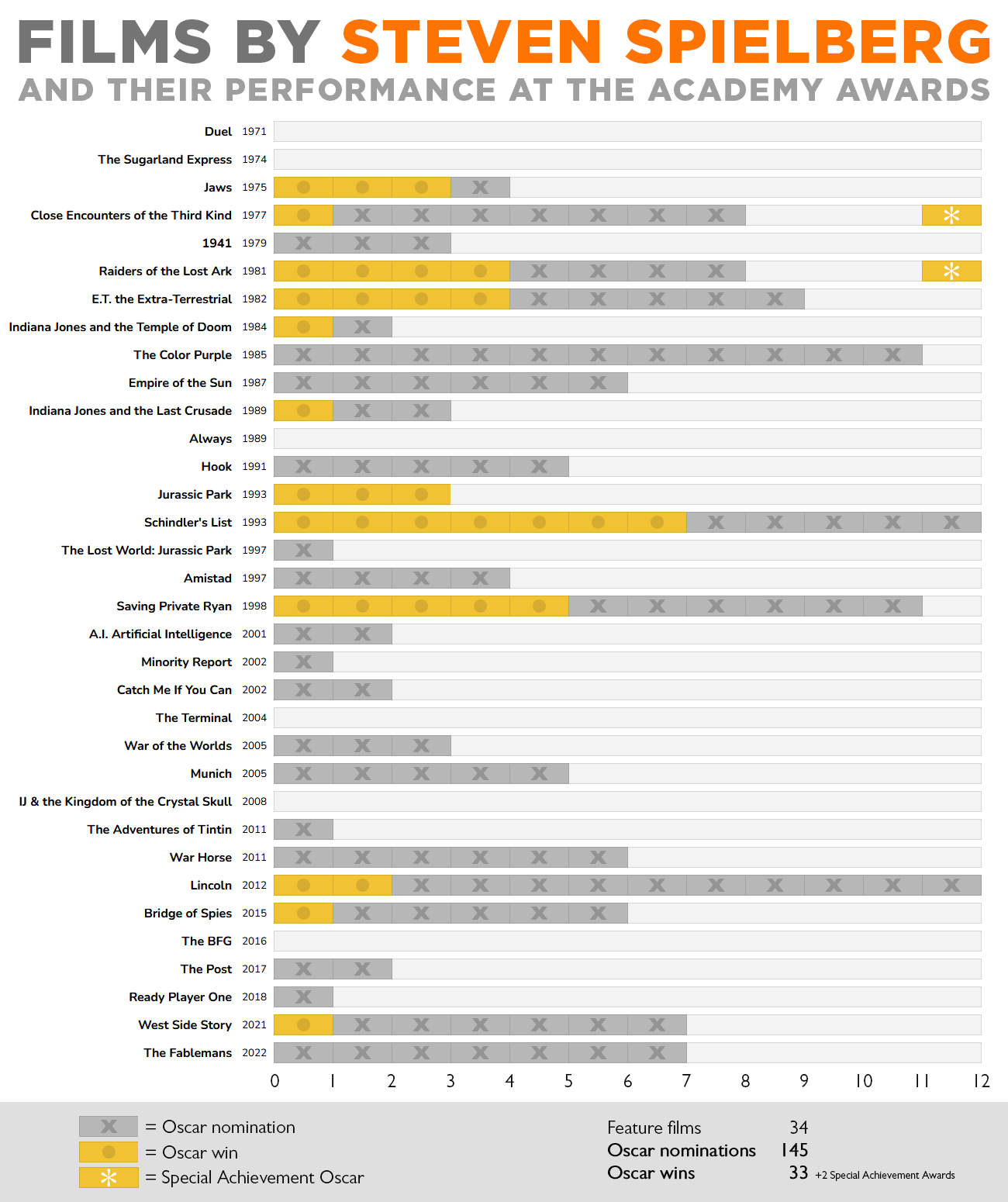 1. Here’s a chart showing all the Academy Award nominations and wins of movies directed by Steven Spielberg. The total is 145 nominations and 33 wins, which is a pretty normal ratio considering most categories have 5 nominees.