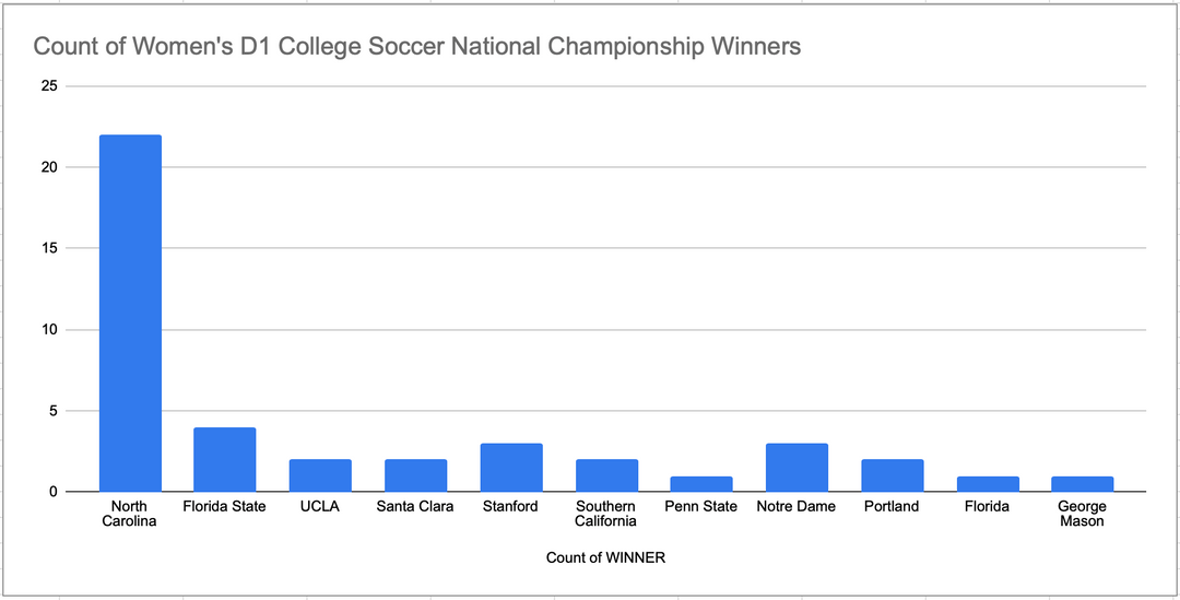 Google Sheets; [https://www.ncaa.com/news/soccer-women/article/2024-12-09/womens-soccer-teams-most-ncaa-di-national-championships](https://www.ncaa.com/news/soccer-women/article/2024-12-09/womens-soccer-teams-most-ncaa-di-national-championships)