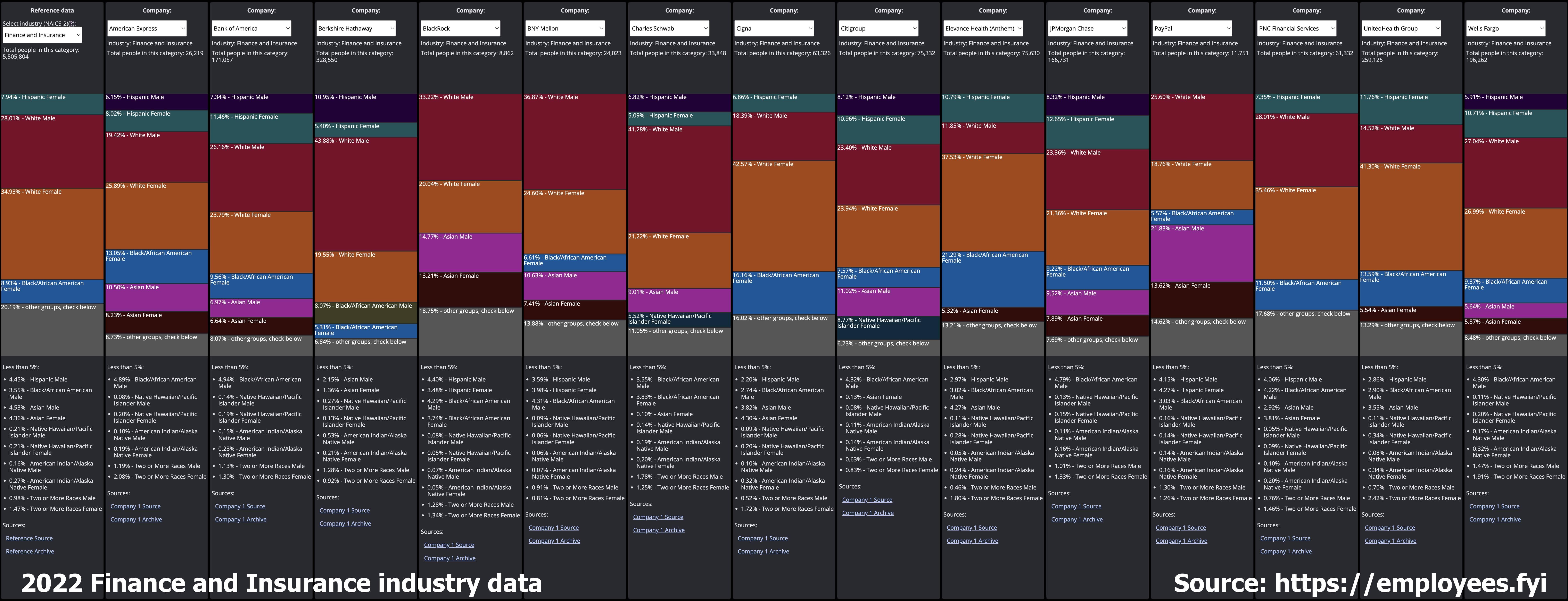 [OC] U.S. Finance and Insurance industry employee demographics (2022) Posted by employeesfyi Tags:DataData Is BeautifulDataIsBeautiful 2 comments How does this help or hinder current events and why is it beautiful, go. Cool chart but there is an elephant in the room. Comments are closed.