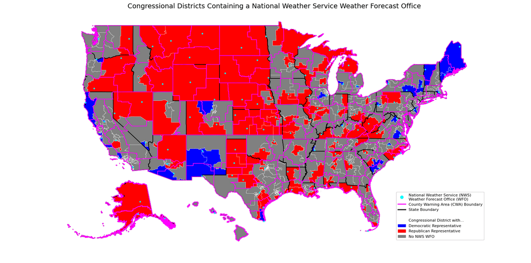 The first page shows the location of NWS Weather Forecast Offices, which congressional districts contain them, and which party represents those districts in the US House of Representatives. There are 103 US House Representatives with a NWS Weather Forecast Office in their district, 70 Republicans and 33 Democrats. Some districts in cities are small and may be hard to see. Some large districts (for example, Alaska) contain more than one office. Not shown are Weather Forecast Offices in Puerto Rico and Guam, or any of the National Weather Service’s other facilities, for example River Forecast Centers (usually co-located with Weather Forecast Offices) or the National Hurricane Center. The second slide shows the same map with the National Weather Service’s County Warning Area Boundaries overlaid; these are effectively the limits for where each office is responsible for issuing predictions. Using these boundaries, you can determine where your own local office is located.