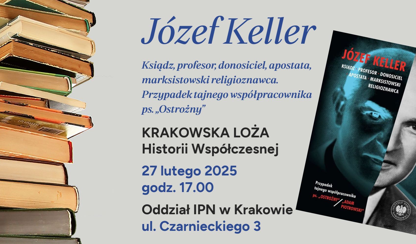 Zapraszamy na pierwsze w 2025 r. spotkanie Krakowskiej Loży Historii Współczesnej w podgórskiej siedzibie krakowskiego oddziału IPN przy ul. Czarnieckiego 3. 27 lutego 2025 r. porozmawiamy o książce pt. „Józef Keller – ksiądz, profesor, donosiciel, apostata, marksistowski religioznawca. Przypadek tajnego współpracownika ps. „Ostrożny” / „Adam Piotrowski”. Początek spotkania o godz. 17.00.