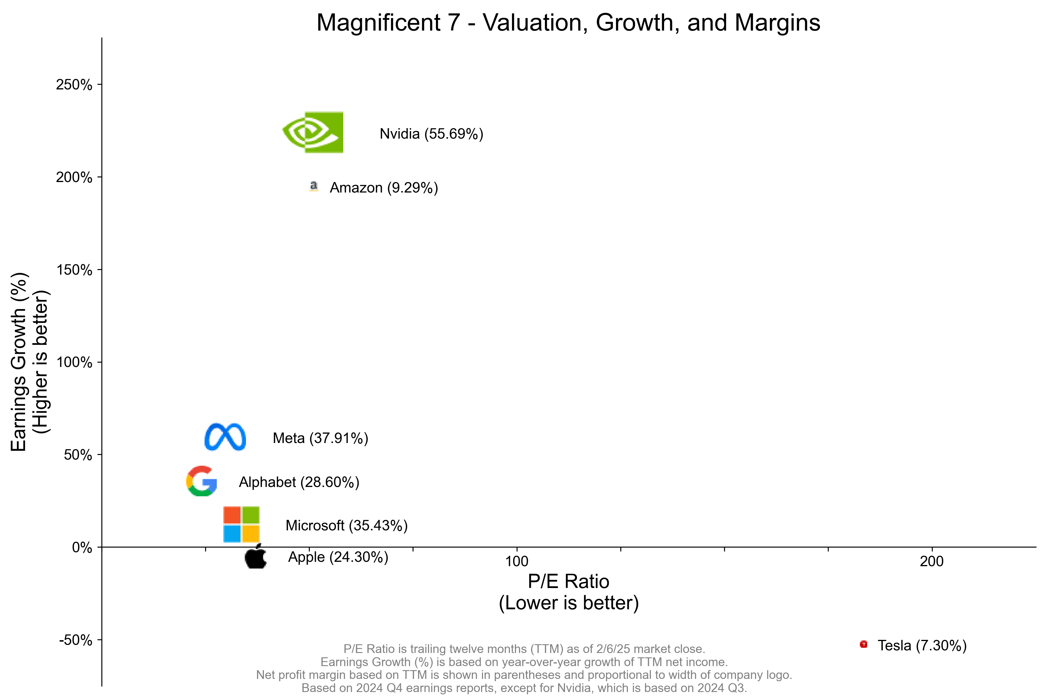 If you need to add text at the bottom to explain data and design decisions, it’s not beautiful. And you don’t have to say Higher/lower is better. Scaling the logos with the profit margin is a terrible design because the logos themselves are all different and negative profit margins exist. Finally, the earnings growth should be forward looking, it’s useless to compare PE with trailing EPS growth.
