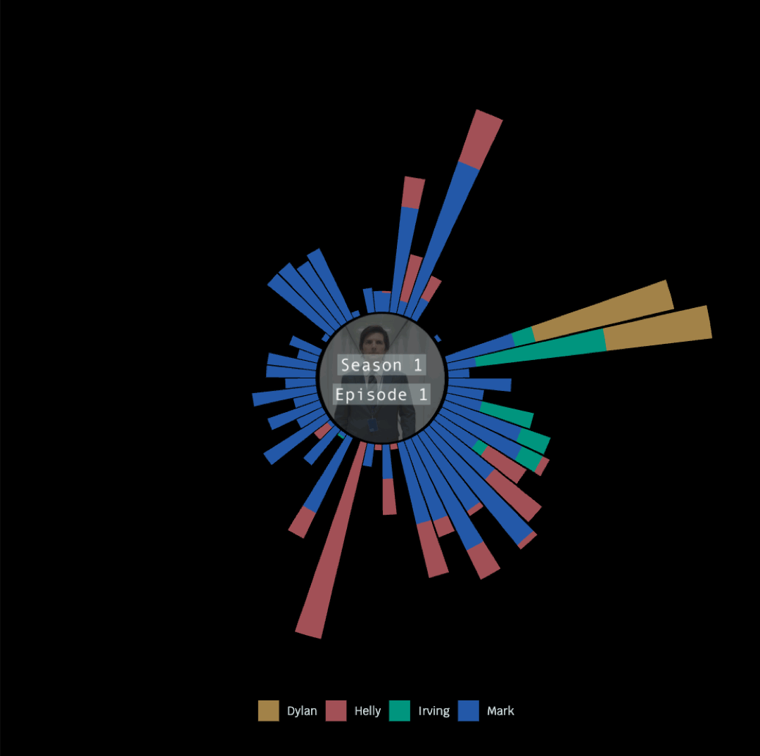 This analysis was made possible by the mdr R package, which used data originally compiled by the Severance wiki. For each episode we count the number of words each of the four main characters (Mark, Helly, Dylan, and Irving) speak in each minute.