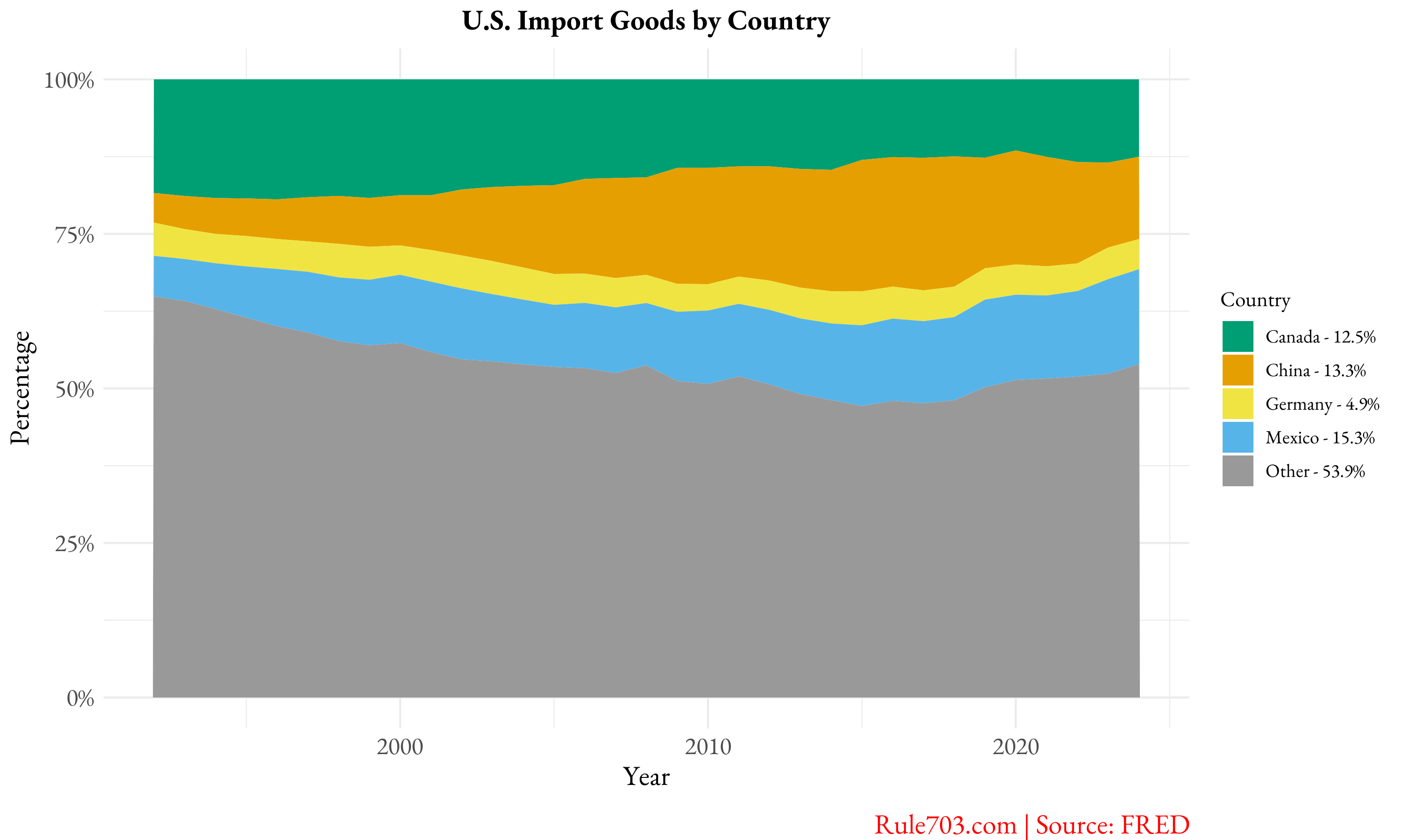 1. This stacked area chart, created using the ggplot2 package in R, visualizes the composition of U.S. import goods by country over time. The data from the Federal Reserve Economic Data (FRED) displays the percentage of total U.S. imports attributed to major trading partners—Canada, [China](https://fred.stlouisfed.org/series/IMPCH), Mexico, and Germany—while the “Other” category represents imports from all remaining countries.
