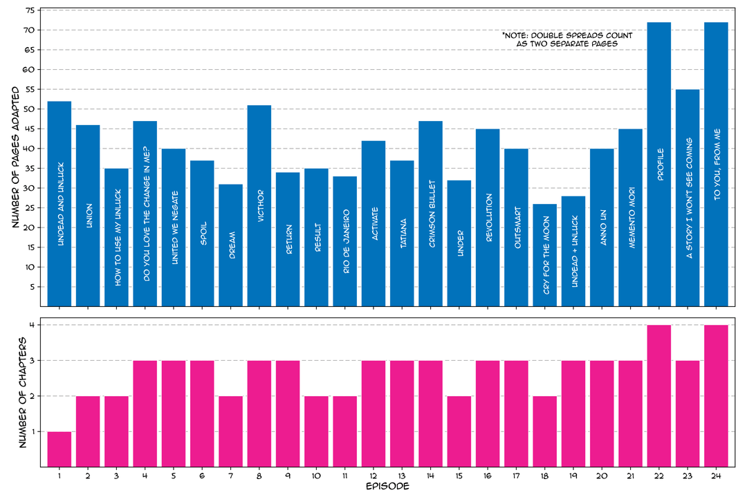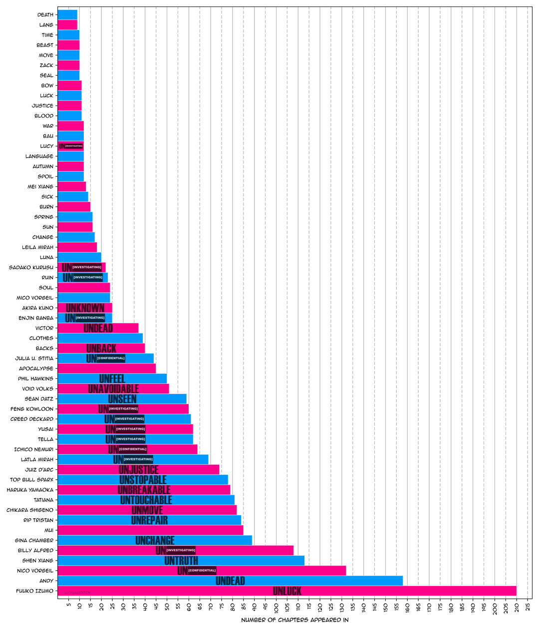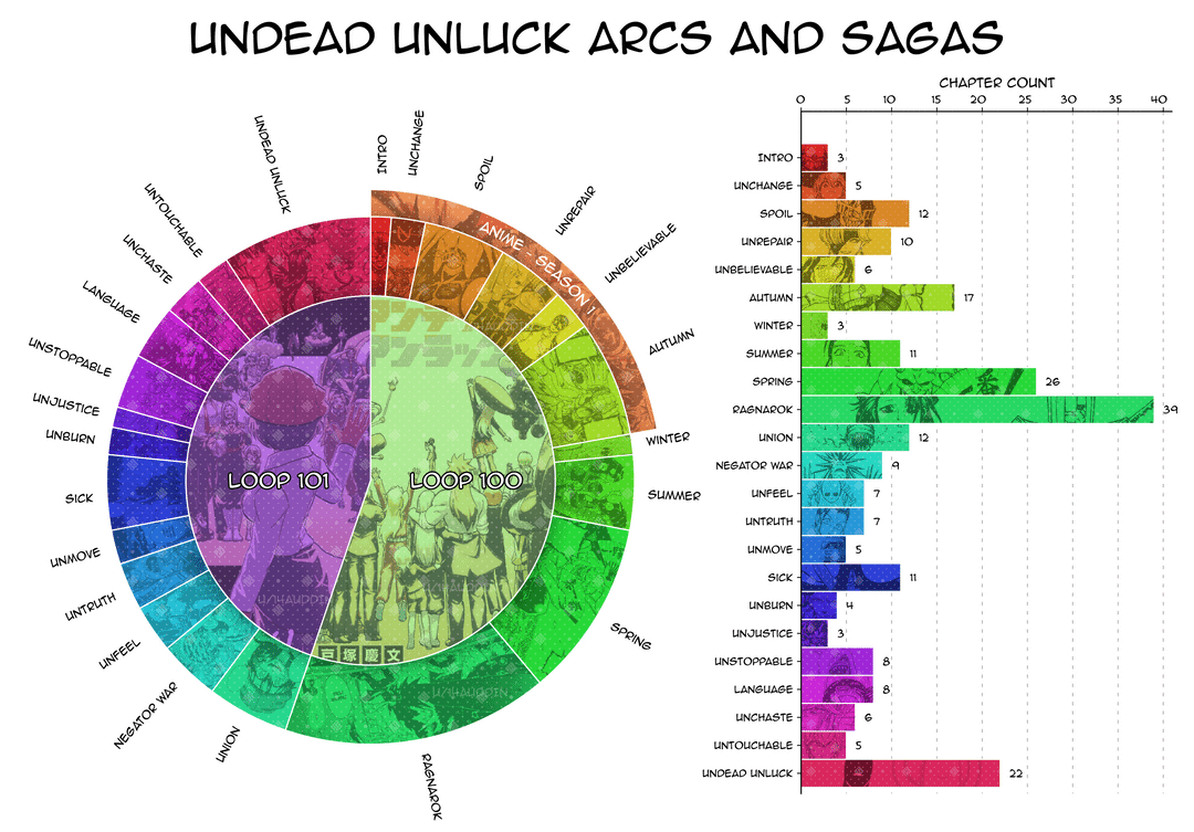 Undead Unluck Anime and Manga Reddit discussion trends, Story Arcs and Sagas Chapter Count, pages adapted per episode of Season 1 of the Anime, character appearances throughout the manga, and total character appearances in the manga.