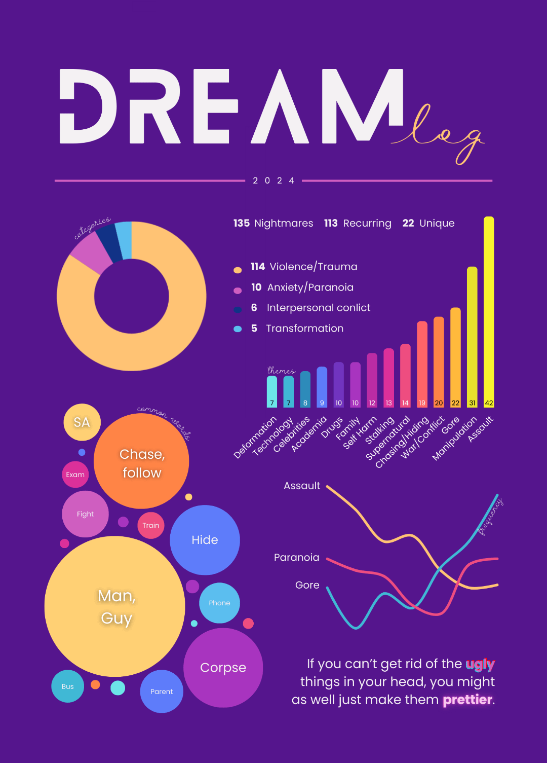 I've had troubles sleeping for a few years now, and even with therapy there's no easy fix. I started logging in late 2023 and I'm not really consistent, but so far I wrote over 10000 words in a word document. I love data visualization and I figured it might be a way to exorcise some bad thoughts. I actually did go a couple days without nightmares after making this. It's obviously not detailed but it's not for a research paper, just for me. In the future I might start logging more metadata and some data about my personal health to see how things correlate