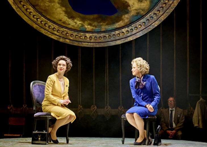 A minimal circular set comprises of a modest stage underneath a foreboding coin-like disc with The Queen’s profile tilted downwards so as to foreshadow all over which it looms. Interestingly, the empathy for working people that is increasingly entertained by Liz is the subject of imagined tension here: most notably, when – to Maggie’s horror – Liz moves steadily outwards from their private conversations to an entire Christmas Speech that leads Maggie to suspect Liz of all but veering headfirst into communism.