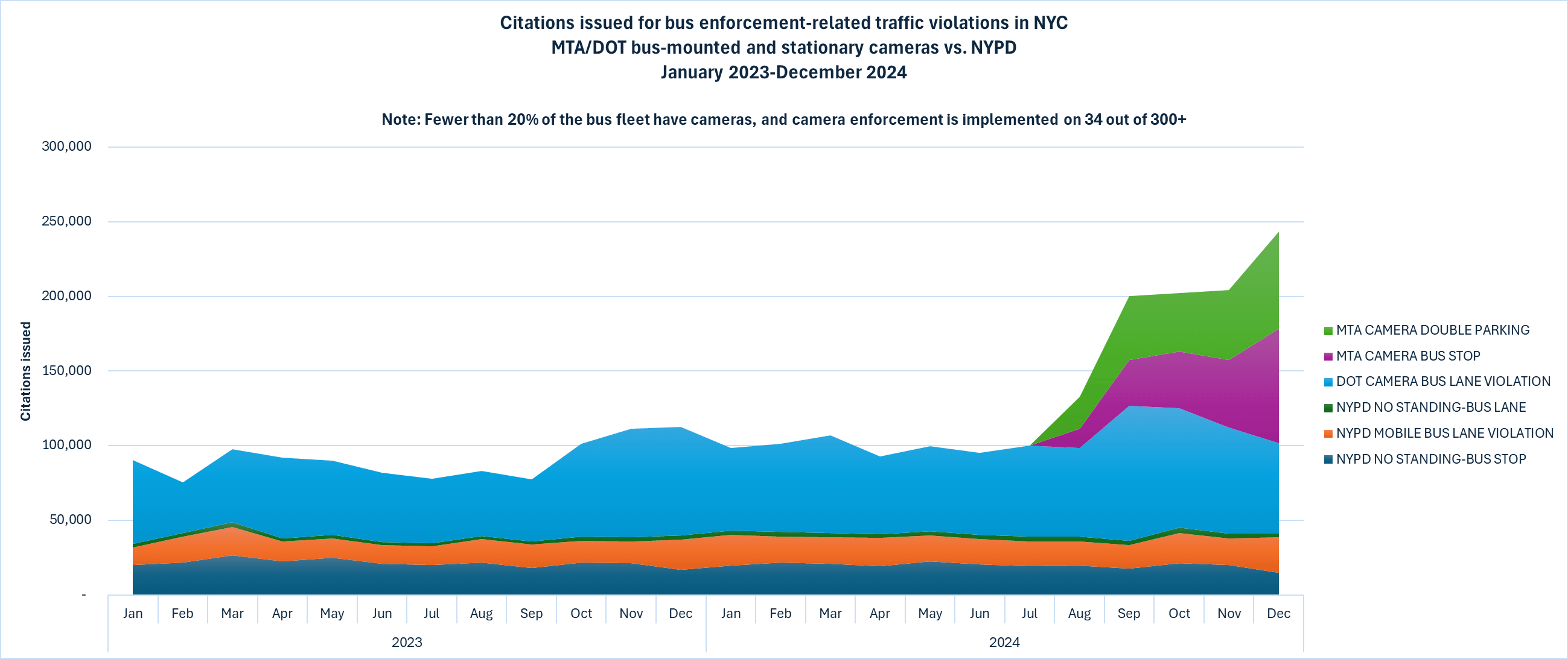 In August 2024, the MTA (the public transit agency) equipped a handful of buses with cameras that issue fines for double parking and blocking bus stops. One bus takes a picture, and if another bus takes a picture of the same vehicle after at least 4 mins, footage is sent to a review team to see if there were legitimate reasons the car was where it was (i.e. obeying law enforcement orders, avoiding a hazard, etc.). Now we can see how rarely the police penalized drivers for impeding buses.