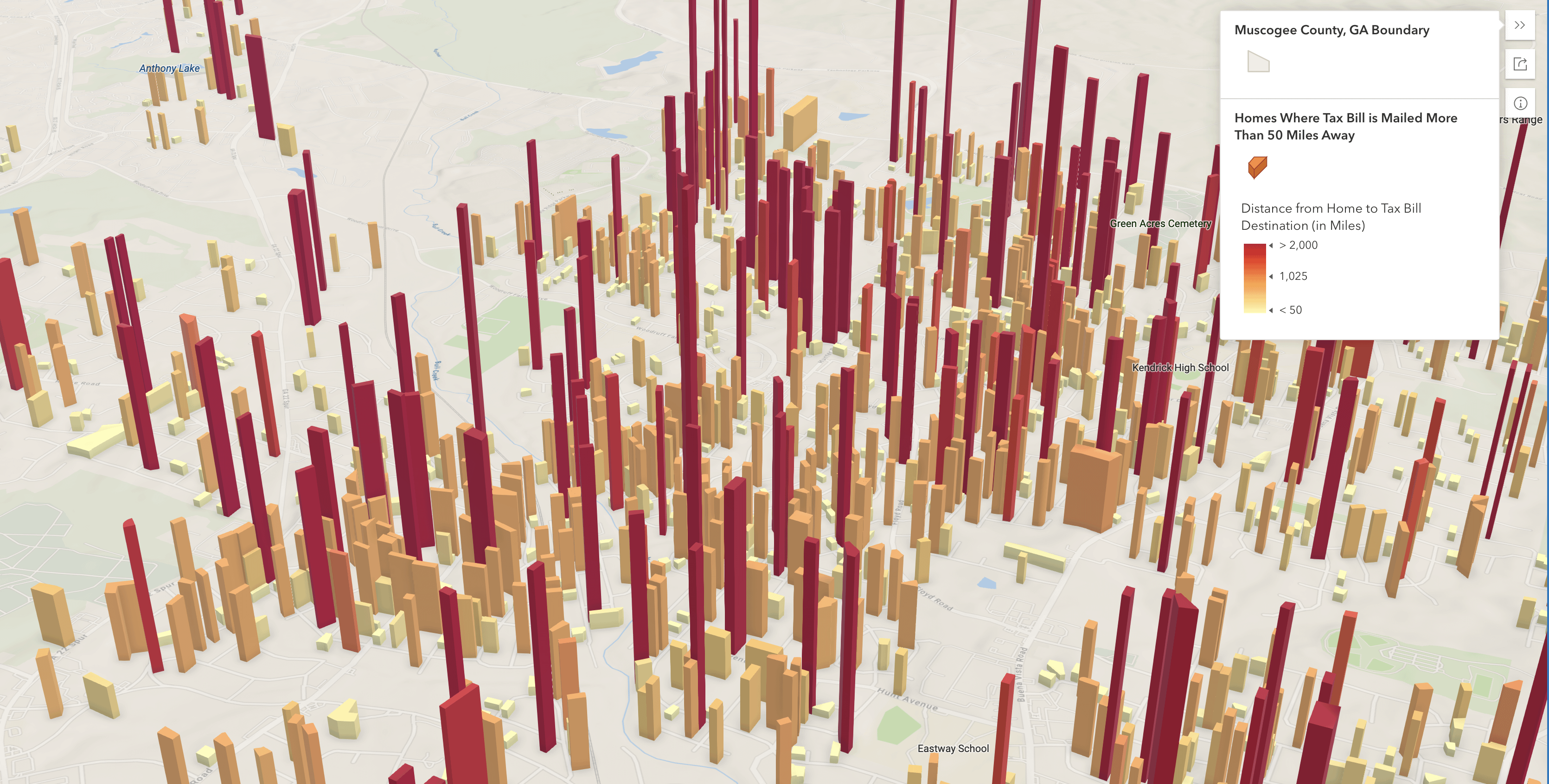 Property tax bill mailing address data can be indicative of where ownership of a property sits. In this map, properties are filtered for single family homes. Then, tax bill mailing address destinations were geocoded and distance between parcel centroid and tax bill address destination is calculated and appended to the parcel table. The taller the parcel, the farther away ownership for the home sits.